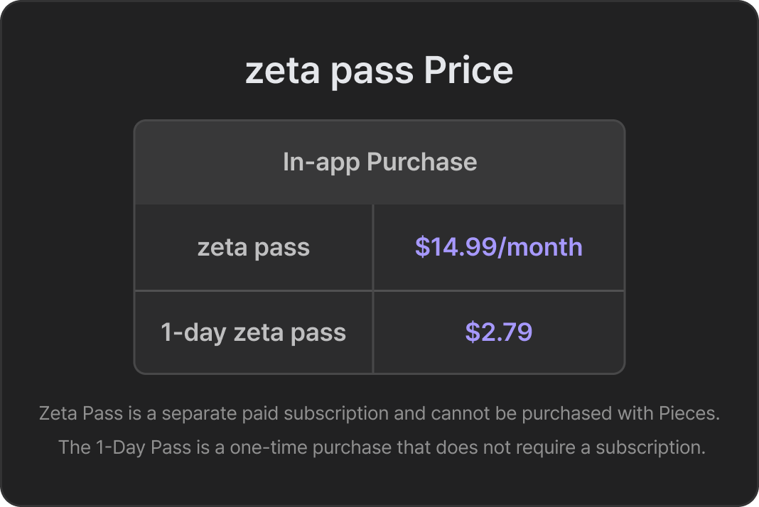 ✅ Zeta Pass is a separate paid subscription and cannot be purchased with Pieces. ✅ Your registered payment method will be charged automatically on your scheduled billing date each month. ✅ Bonus Pieces from your subscription are valid until your next billing date.