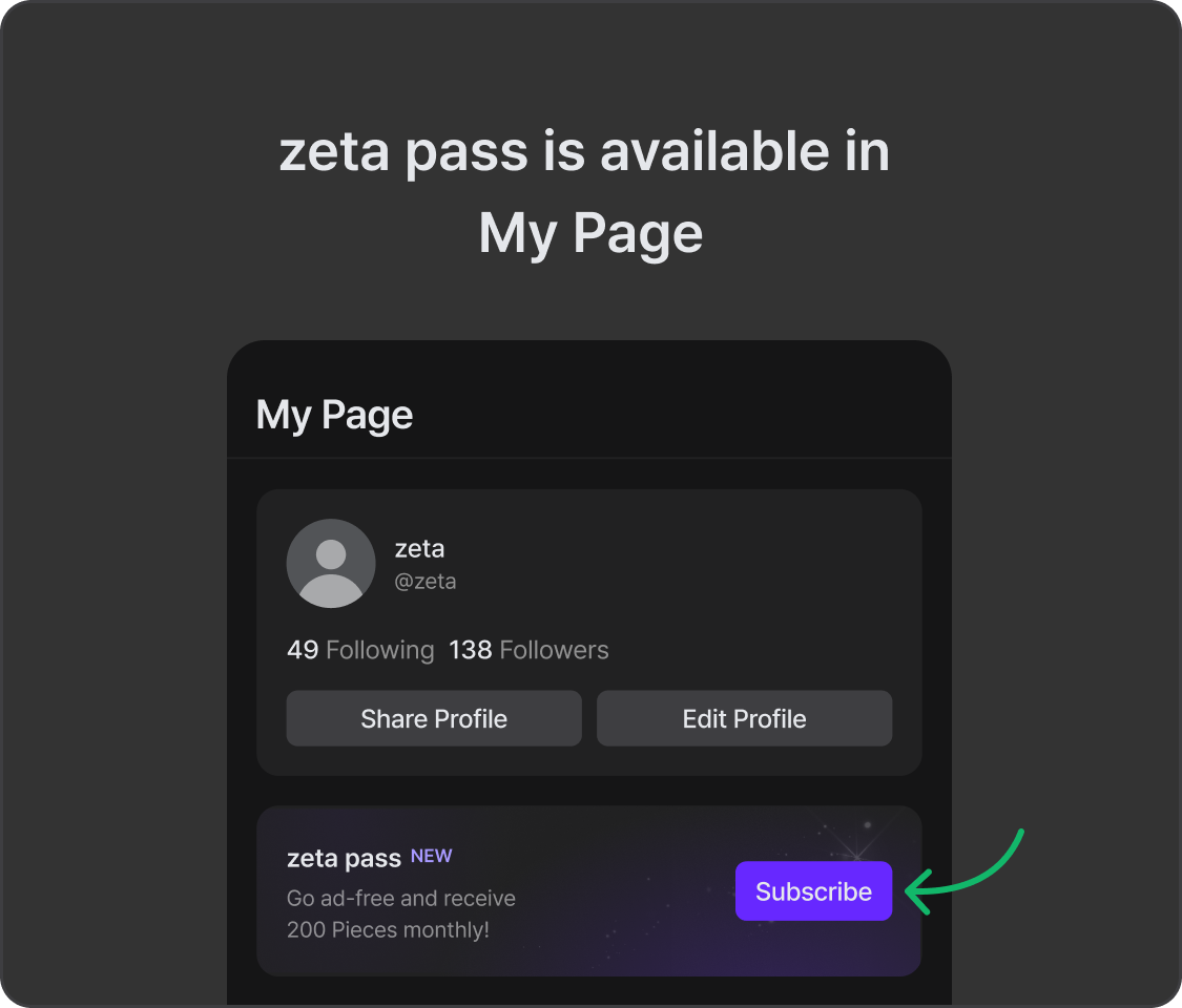 Just go to My Page, tap the 'Subscribe' button under zeta pass, and follow the prompts. Your remaining pro days will be credited as Pieces, and your new zeta pass subscription will begin immediately.