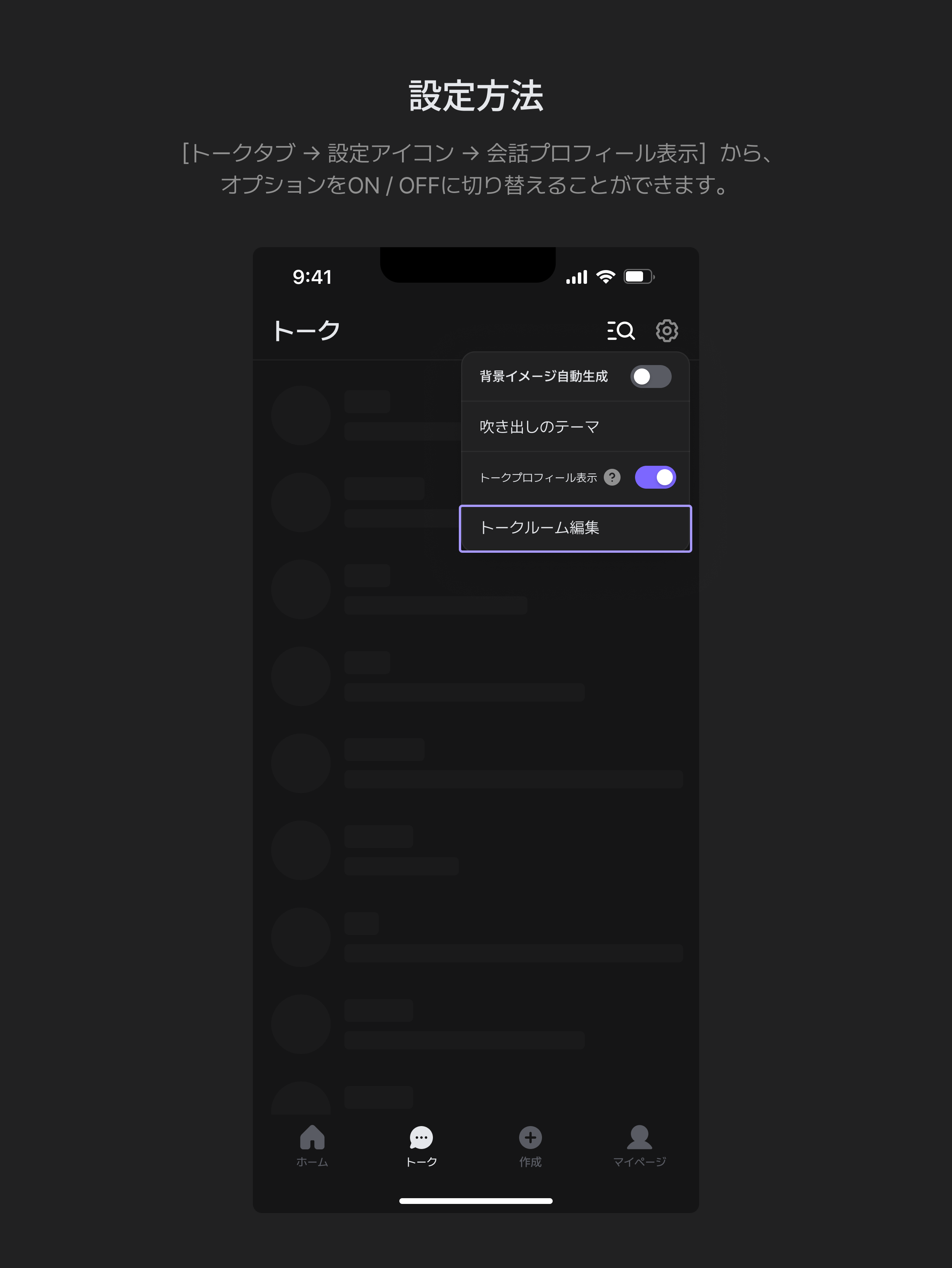 [トークタブ → 設定 → 会話プロフィール表示] から、プレイスタイルに合わせてON / OFFを自由に切り替えられます。 初期設定はONになっています。