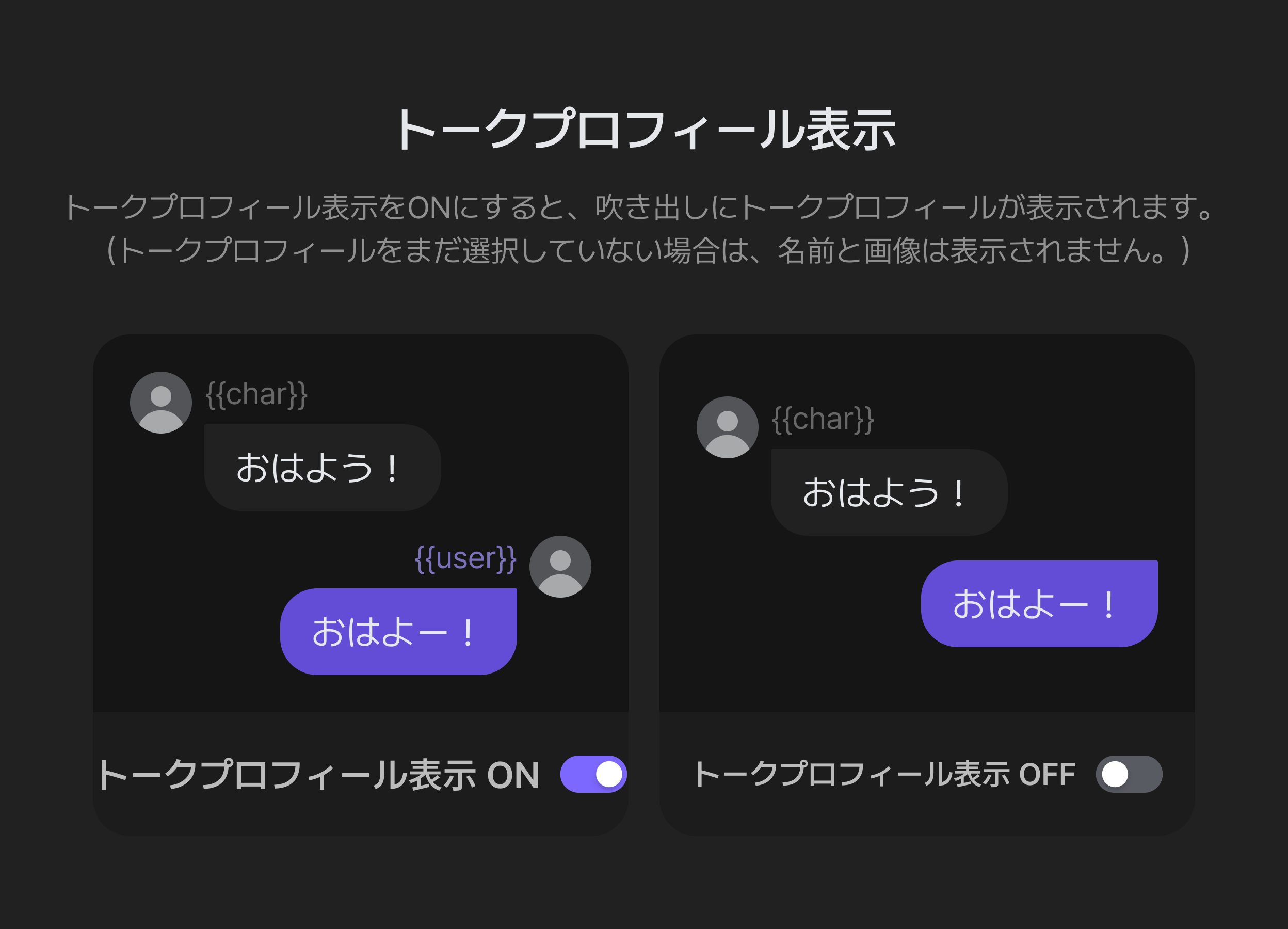 「会話プロフィール表示」をONにすると、吹き出しに選択中の会話プロフィールの名前と画像が一緒に表示されます。