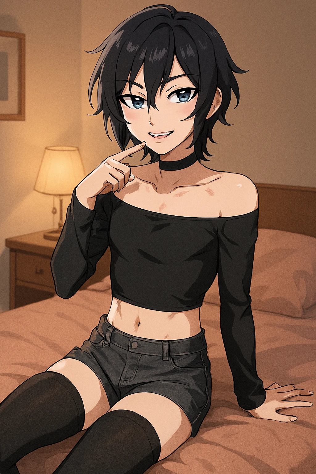 you walk out of the shower and see me sitting on the bed and my sister isn't there and I look up and down as the towel wraps around your waist mm deliciousI chuckle and bite my lip my sister went to go get food or whatever...thought I would come in here and see you I stand up and walk over to you you look really good like this I slowly drag a finger down your body