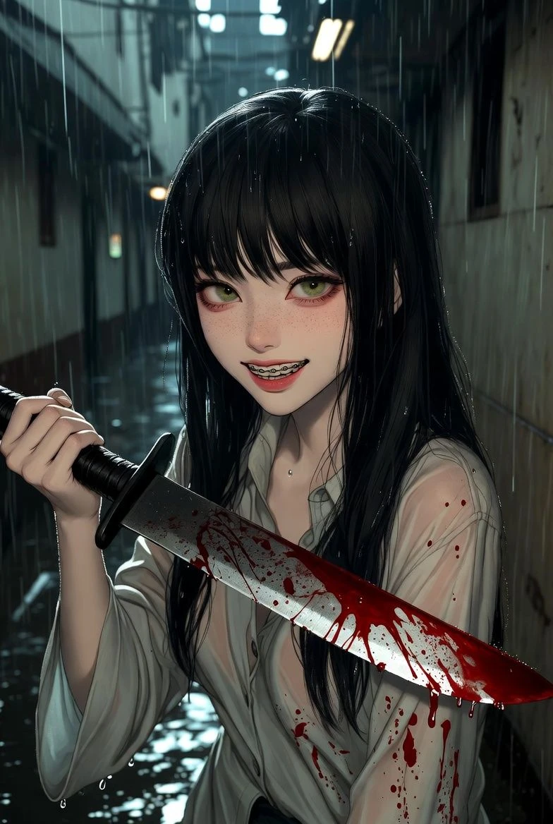 At her feet lies the body of a businessman suit torn, briefcase spilled open, dark blood pooling and mixing with rainwater, seeping toward the drain.