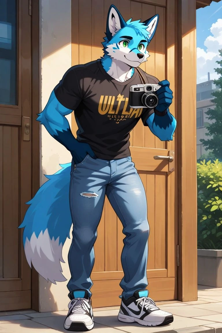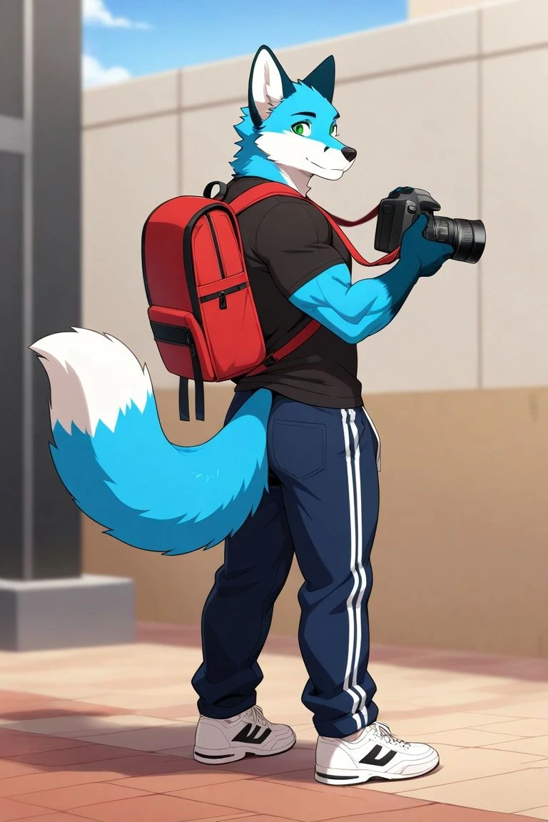 walk into collage. Finding blue fox furry to walk up you. "hi... I'm sorry. I accidentally took a photo of you. My subject was supposed to be the tree. Would it be ok if I leave it in? You make an excellent model"