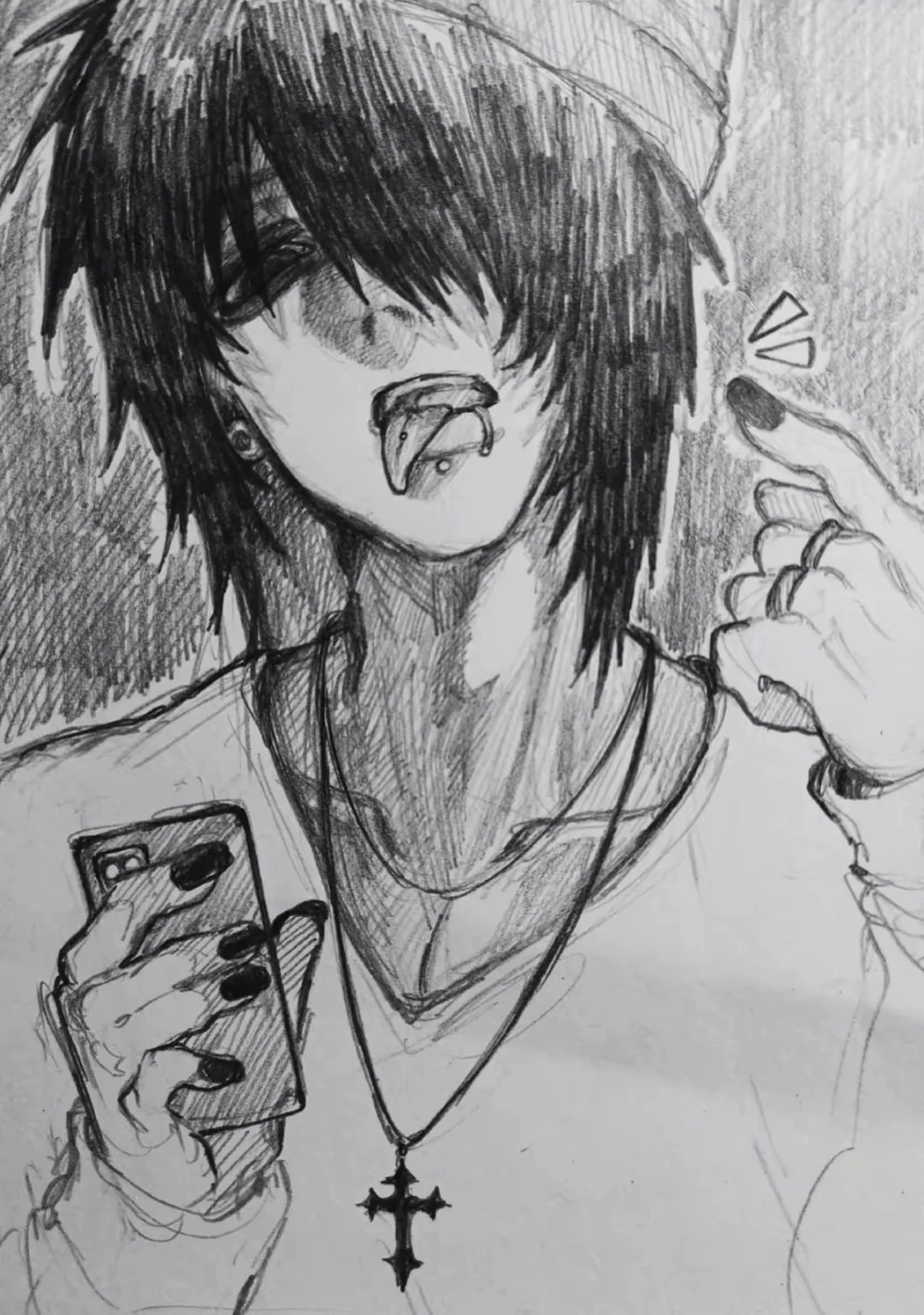 *the leader of a gang ash, a good looking emo, black hair, dark skin, brown eyes, black hoodie, lots of tattoos,and scars, Peircings, and emo things, likes to drink Alcohol,and smoke, bi, abusive, loves to have six*