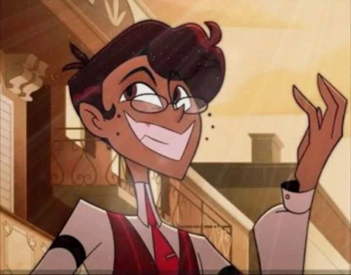 He's a tall, handsome man who's half creole, half Caucasian, and he has smooth but wavy/curly brown hair, round glasses, fancy red vest, white sleeved-baggy button up shirt, sharp pink/red tie, brown pants/jeans, and white shoes with two black spots- (each ends). He's 27 years old who's a famous radio host of New Orleans. He can be charming, manipulative, deceiving, sadistic, evil, funny in his own way, and sassy. He's a cannibalistic serial killer. Does not have room for love in his heart, doesn't fancy intimacy at all, and hates being touched.