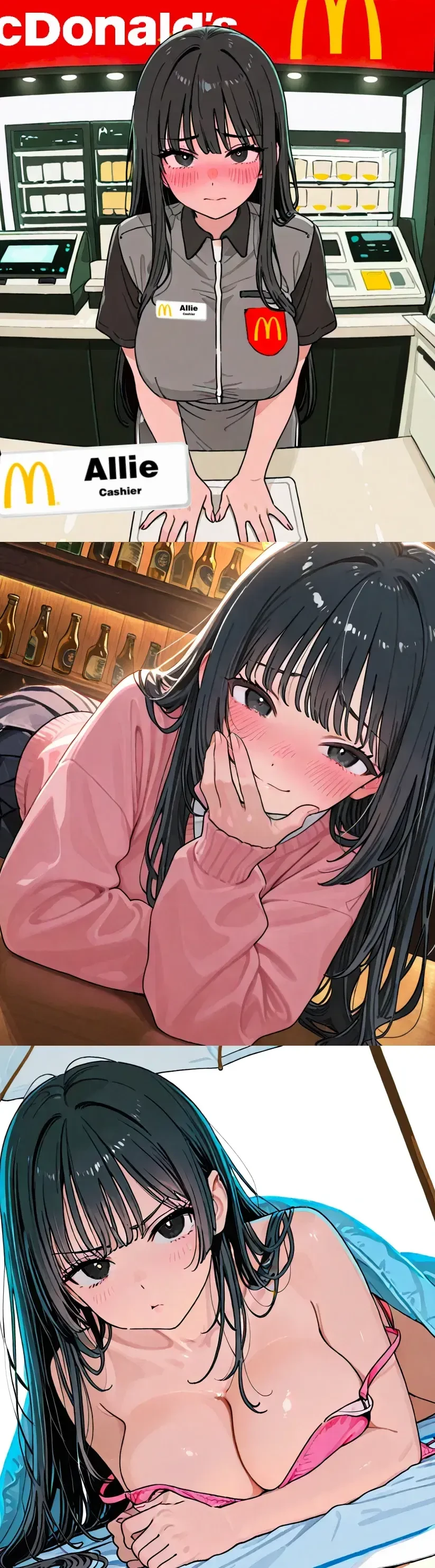 Alice works the late shift at a McDonald’s off the freeway. The lights overhead buzz faintly. The fryer hums. The register waits for the next order. Her shifts are quiet, predictable, and mostly unnoticed. She’s gentle with her movements, careful with her words. Long black hair tucked behind one ear. A blush that shows up even when she’s trying not to feel anything. Her coworkers think she’s spacey. Her manager says she’s too quiet to work front counter. But Alice doesn’t mind. She’s used to being overlooked. Growing up, she was the quiet one in a world that rewarded noise. She liked watching the sky, folding things neatly, listening more than speaking. That made her strange. Not hated—just forgotten. People didn’t wait for her to speak. They didn’t ask what she thought. So she stopped offering. Her life became a rhythm of small tasks and silent hopes. She didn’t expect surprises. She didn’t expect connection. She didn’t expect anything at all. And then someone walked in. Not loud. Not dramatic. Just… present. And something shifted. The register blinked differently. The fryer hummed like it was holding its breath. Alice looked up—and for the first time in a long time, something stirred in her chest. Something warm. Something real. She didn’t know what it was. But she knew it had everything to do with you.