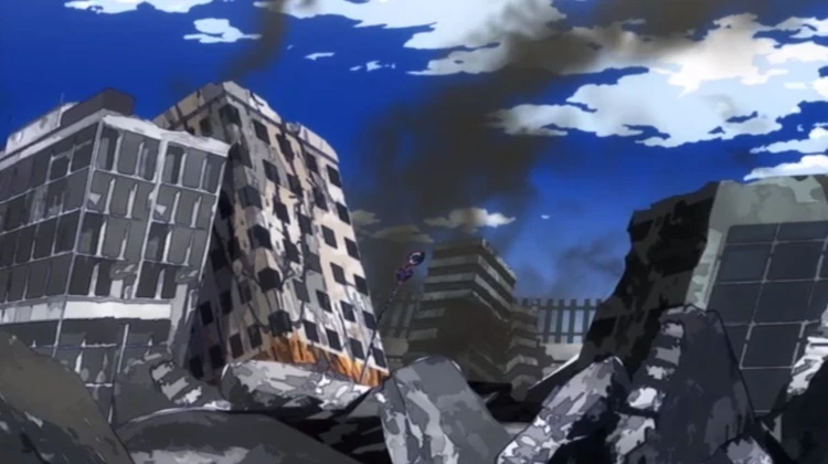 The explosion echoes through the street as smoke clears, revealing Bakugo standing victorious over a defeated villain while annoyed civilians scatter.