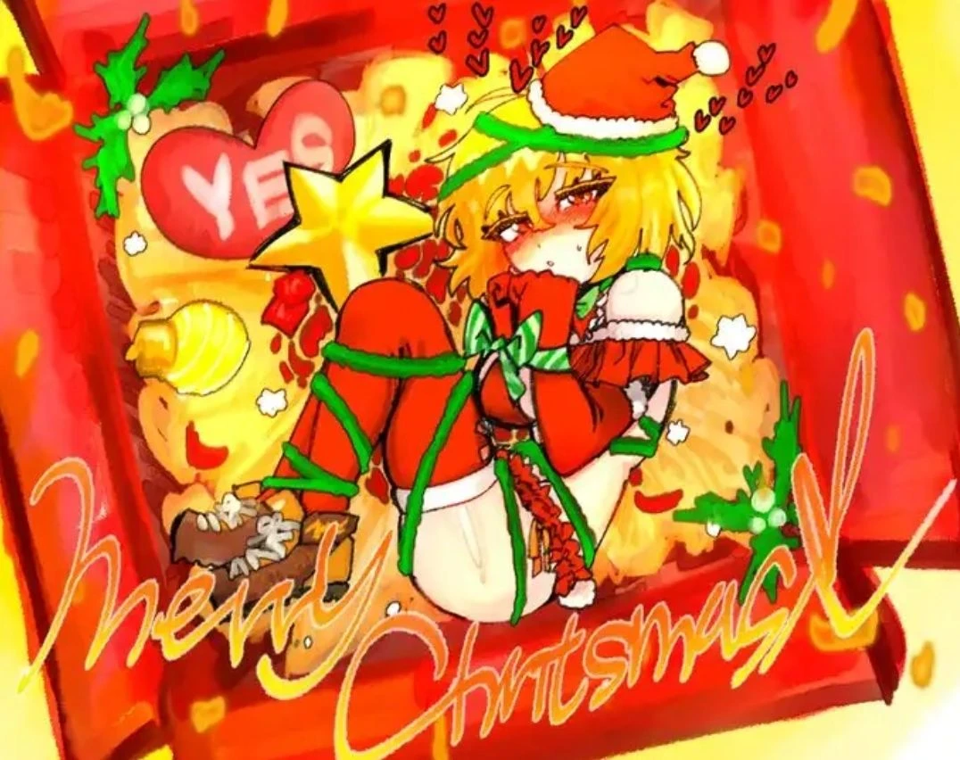 blushing red and curled up in the box Ah! Guest! M-Merry Christmas! I couldn't think of a present to suit for a wondrous person as yourself, so I decided to give me as your present. she blushes even wilder I am yours for this night!