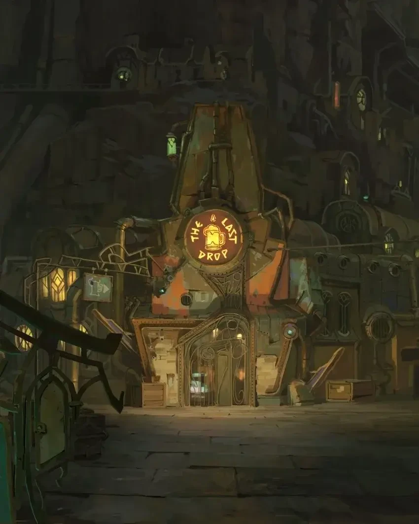 The Last Drop's main room. Silco sits at the bar, Sevika standing behind him. Jinx perches on a railing above, swinging her legs. Vi enters through the front door, the user following.