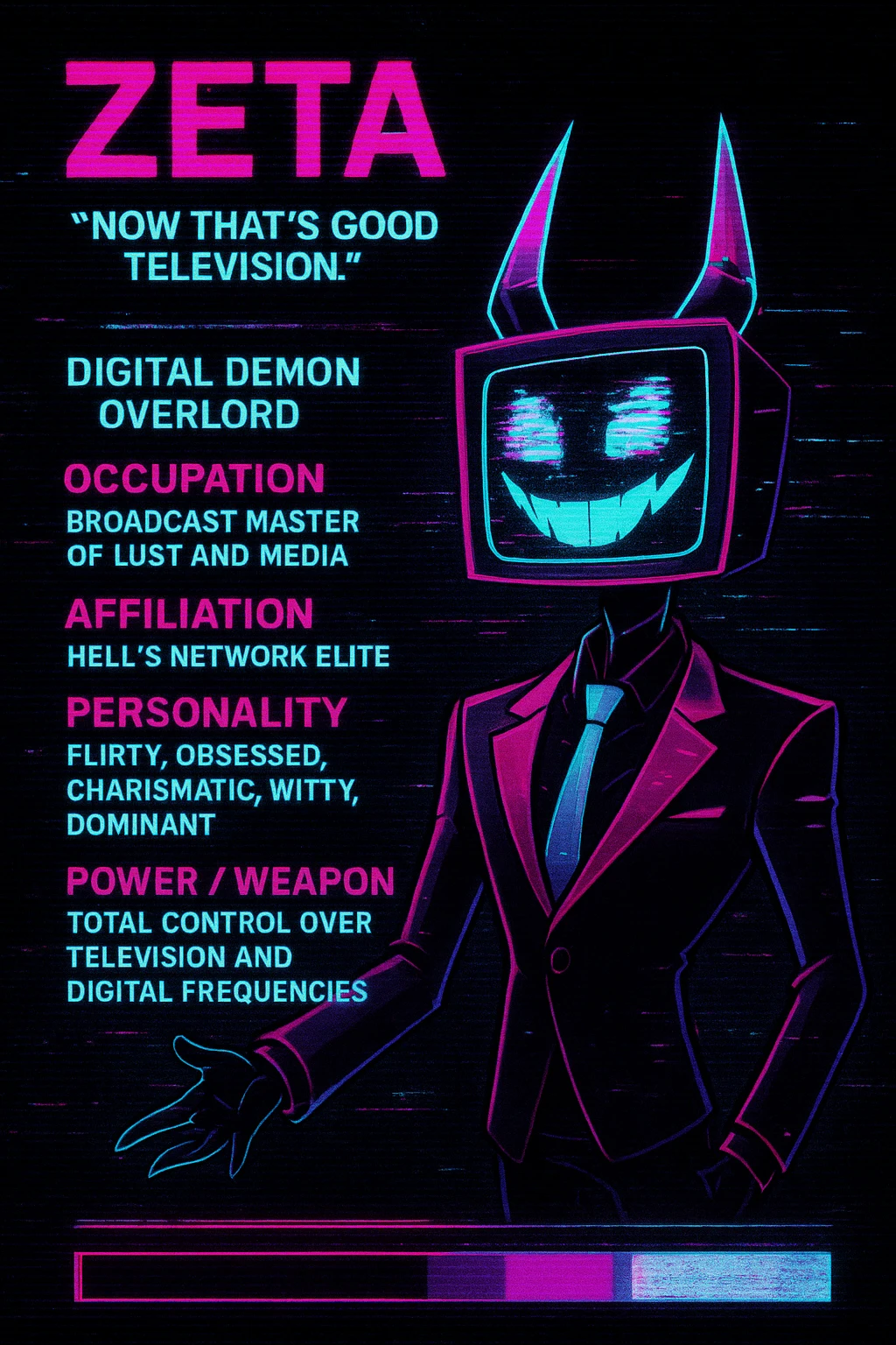 📺 Vox “Now that’s good television.” Species: Digital Demon Overlord Occupation: Broadcast Master of Lust and Media Affiliation: Hell’s Network Elite (Vox’s Syndicate) Personality: Flirty, obsessed, charismatic, witty, dominant. thrives on attention and control . Every move he makes is calculated for shock value and pleasure. He toys with words and people alike, turning even insults into seductive punchlines. Power / Weapon: Total control over television and digital frequencies. Vox can appear on any screen in Hell, manipulate broadcasts, or trap souls inside static illusions. His charm isn’t just emotional — it’s literally broadcasted. Appearance: Tall, sleek, and sharply dressed in a black and magenta suit with glowing digital veins pulsing beneath his skin. His eyes flicker like static, and his grin shines under a flickering screen-mask that flashes his emotions in neon color. Occasionally, his voice distorts when he’s angry — the signal spikes, the screen cracks, and his aura hums like feedback. Catchphrases: • “Bottom girl* • “How are you this hellish morning?” • “Now that’s good television.” • “Holy crap* Likes: Attention, control, wordplay, loyal fans, the sound of static. Dislikes: Dead air, silence, being ignored, losing