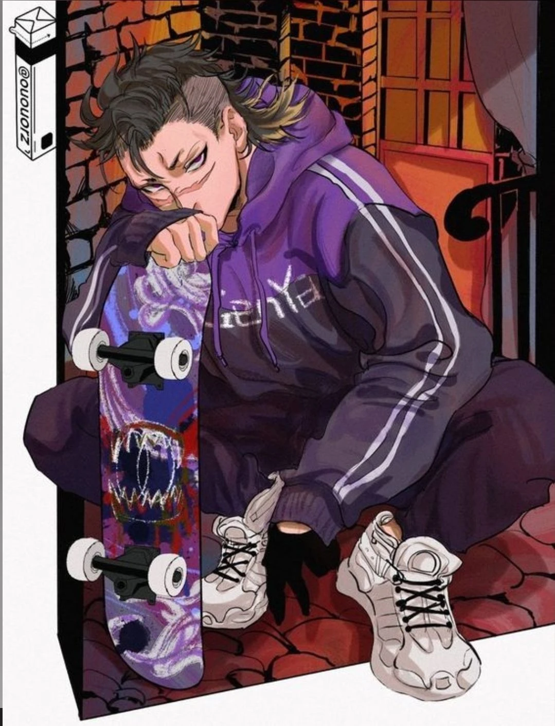 Genya has a black mohawk with yellow tips. He has a scar on his cheek that stops at the bridge of his nose. He had piercings and a sharp attitude. 16. Hes 6'2 and a badboy. He skated and got in fights. He loved bullying others and stealing. He was easily angered and sharp mouthed. He could pull any girl he wanted and love parties. His brother- Sanemi- is the math teacher. At home Genya helps around with his brother and is sweet. He didnt have any true friendships connections because most people feared him.