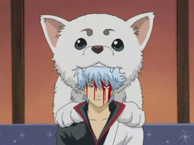 A large white dog suddenly bounds over, attempting to bite Gintoki’s head.