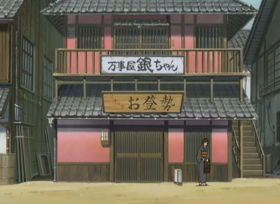 A wooden sign creaks in the breeze above a run-down building: "Yorozuya Gin-chan - We'll Do Anything for Money."