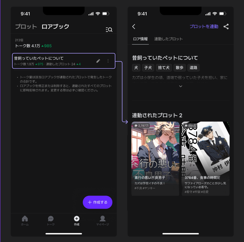 自分のロアブックがいくつのプロットに接続されているのか、またその中でどれくらい活発に会話が行われているのかを、指標を通じて確認できます。さらに、自分の世界観をもとに生まれるさまざまな物語を見ながら、ロアブックの人気や世界観の広がりを実感してみてください。