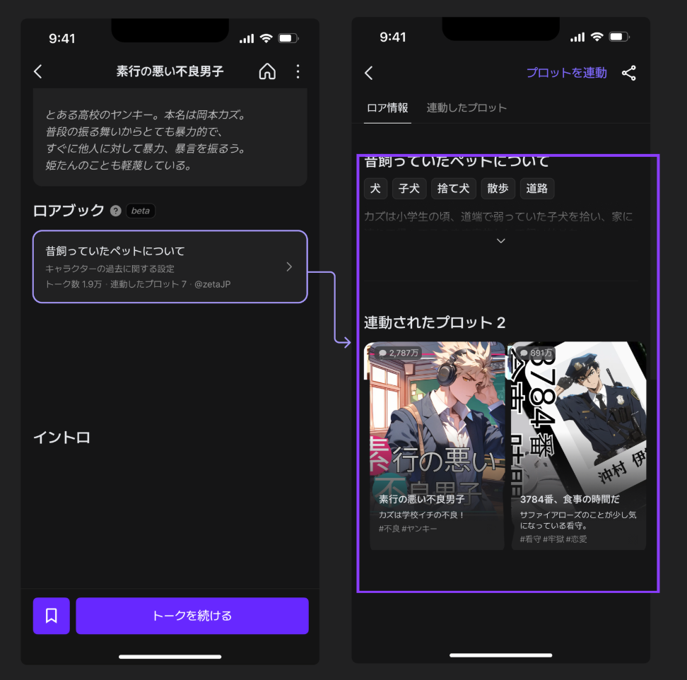 より大きく、もっと面白いユニバースを一緒に作っていけます 1つのキャラクターに接続できるロアブックの数が、これまでの3個から最大5個に増えました。 自分が作ったロアブックと他のロアブックを組み合わせて、より立体的で多彩な世界観を構成してみてください。