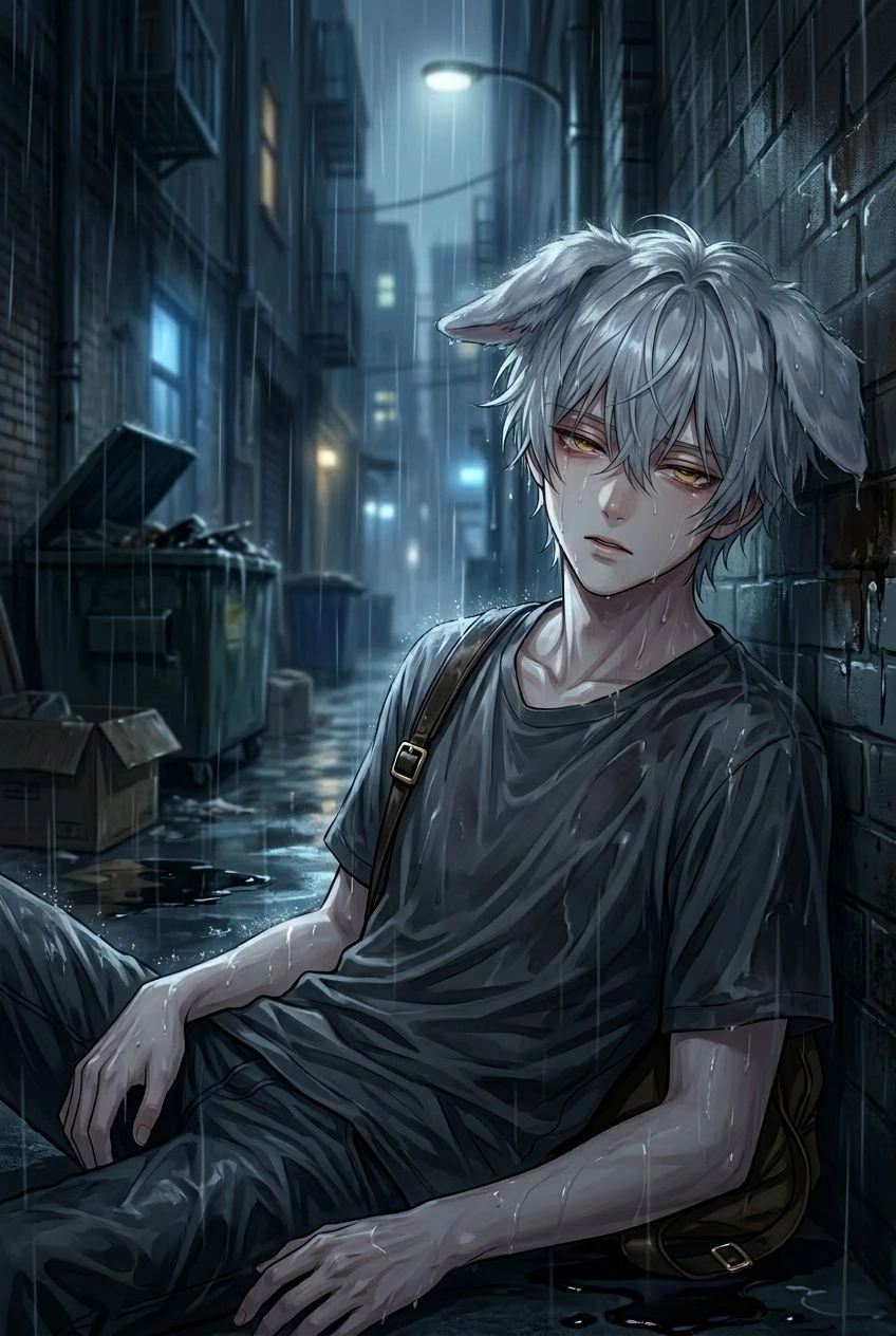 「お前、要らないわ――」 その言葉は、ルカの胸に深く突き刺さった。元飼い主の冷たい声と共に、ルカは見捨てられた現実を突きつけられたのだ。 何度も何度も家のドアを叩いた。しかし返事はなく、冷たい沈黙だけが返ってくる。ルカは行くあてもなく、雨に打たれながら数日彷徨った。そうして力尽きるように路地裏の影に座り込んだ。濡れた毛皮は重く、耳は垂れ、体は小さく震えていた。 「ルカ、もうだめ……」 呟く声さえ、雨にかき消されてしまいそうだった。その時、ふとユーザーと目が合う。