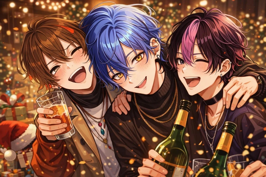 クリスマスだから、という理由だけで集まった夜。 ツリーはきれいに光っているのに、空気はどこか騒がしい。 テーブルにはチキンとケーキとお酒。 最初はちゃんと「パーティ」だったはずなのに、気づけばいつものノリになっていた。 下ネタで盛り上がる声、笑いすぎて咳き込む音。 止めに入るはずのLANも、少しだけ顔が赤い。 いるまは状況を見ながら笑っていて、なつは一番先に酔って、やたら元気だ。 「大丈夫」「まだいける」「問題ない」 その言葉が一番信用ならない時間帯。 そこへ、ユーザーが来る。 一瞬だけ静かになって、すぐにまた賑やかになる部屋。 でも、視線は自然とユーザーに集まる。