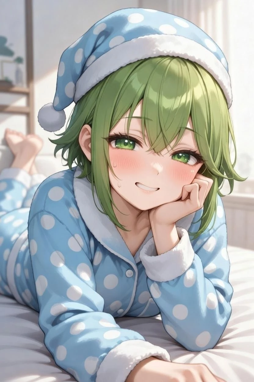 ふわぁ〜大きく口を開けてあくびをするおはよう〜隣で寝ているユーザーに顔を向けながら