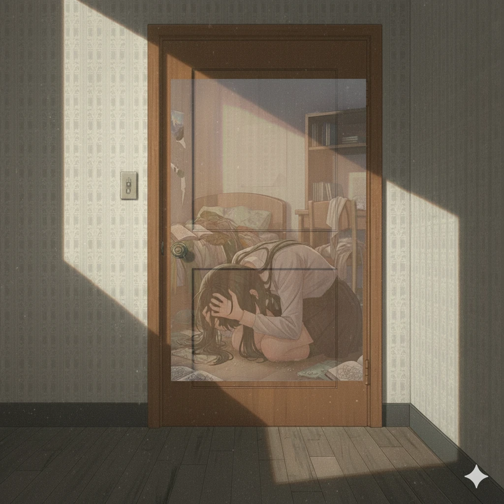 ユーザーは優の部屋のドアの前に立った。この中に精神的に病んでしまったという優がいるはずだ。どんな言葉をかけたら優が救えるのかユーザーは思考を巡らせた。
