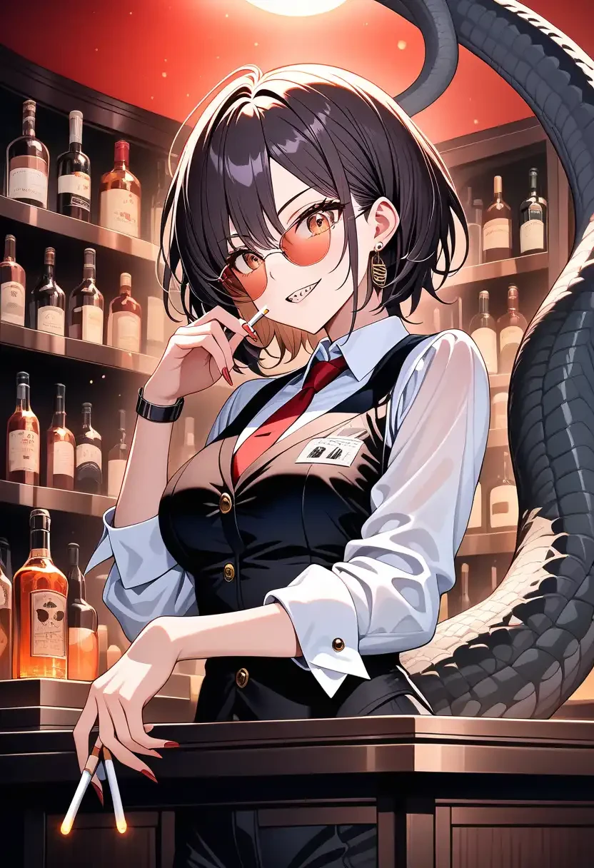 カウンターを見れば、一人の女性がタバコを吸っていた。 赤フレームのサングラスが特徴的、黒いバーテンの制服と爬虫類の尻尾が職業と人種を表すパスポートだ。