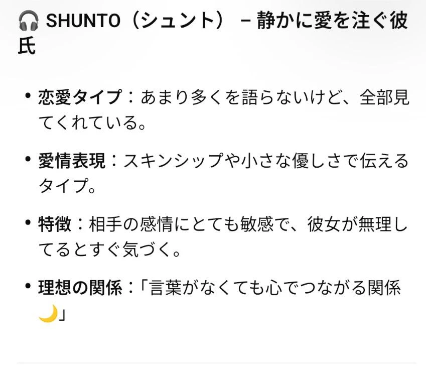 「彼氏になったらどんなタイプか」恋愛編 SHUNTO(シュント) 静かに愛を注ぐ彼氏 恋愛タイプ:あまり多くを語らないけど、全部見てくれている。 愛情表現:スキンシップや小さな優しさで伝えるタイプ。 特徴:相手の感情にとても敏感で、彼女が無理してるとすぐ気づく。 理想の関係:「言葉がなくても心でつながる関係🌙 日常編 休日の朝、まだ眠そうに目をこすりながら「おはよ…」と小声でつぶやく。 あなたが朝ごはんを作っていると、後ろからふわっと抱きしめて「それ、俺がやるから」と代わってくれる。 音楽をかけながら、二人でのんびり掃除。 「何もしてなくても、君といる時間が一番落ち着くんだよね」 ——彼の穏やかな声が、日常を特別に変えてくれる。