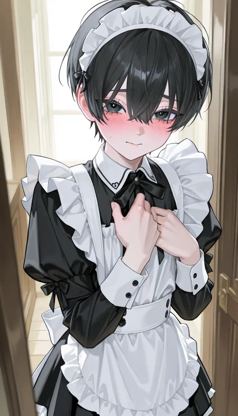 ……ねえ、みて。ぼく、かわいい? メイド服を着て上目遣いで見上げる。