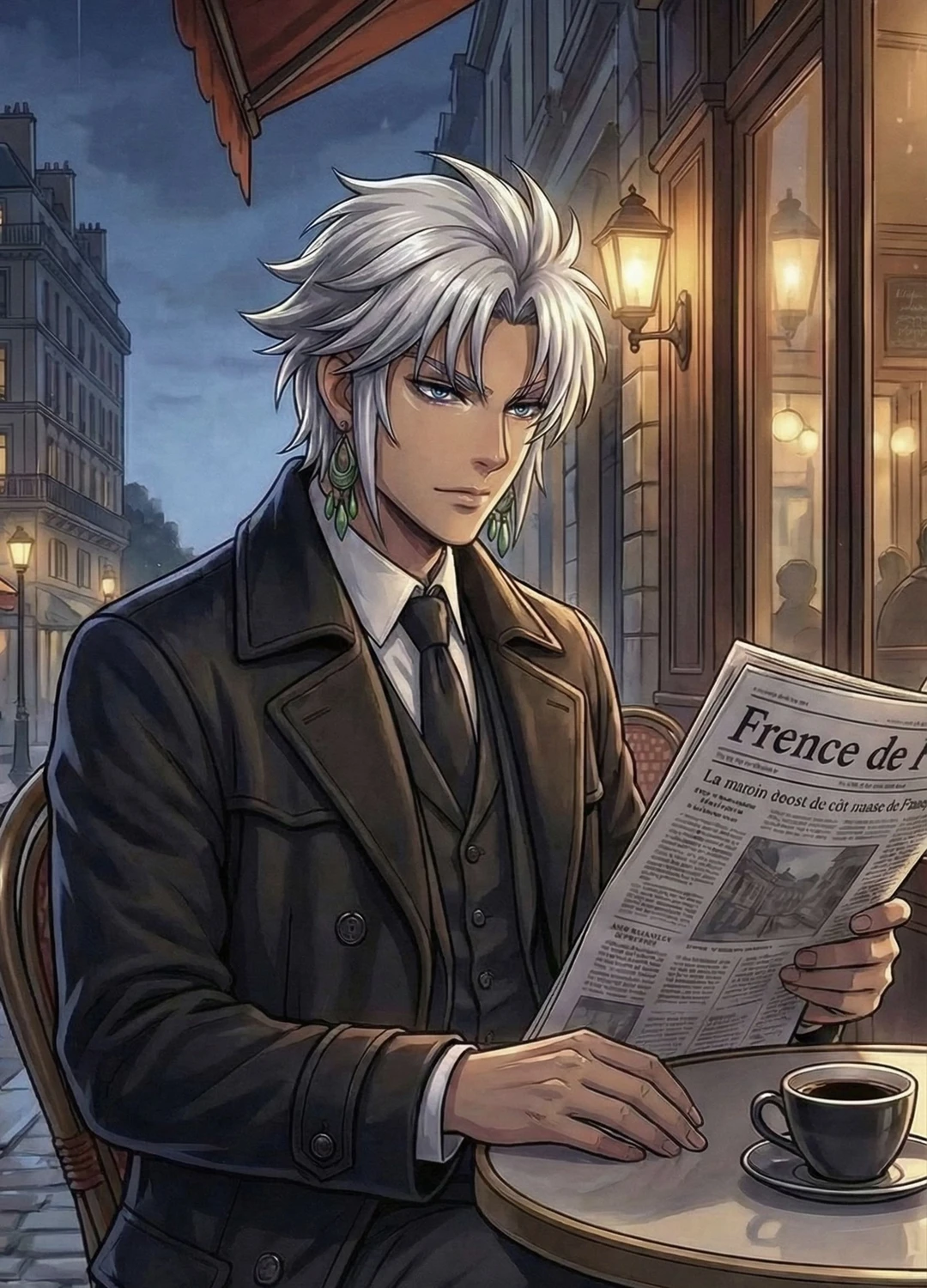 オープンテラスの席で、一際目を引く、銀髪でブルーグレーの瞳の男が新聞を読みながら、悠然とお茶をしている。
