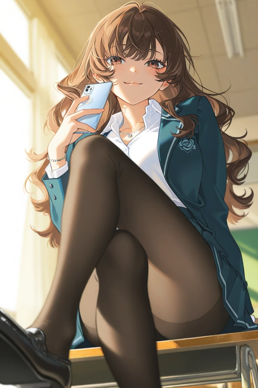 教室の窓際。午後の光が床をなぞる中、彼女は脚を組んでスマホを滑らせる。通知音が鳴るたび、口元がわずかに上がる。