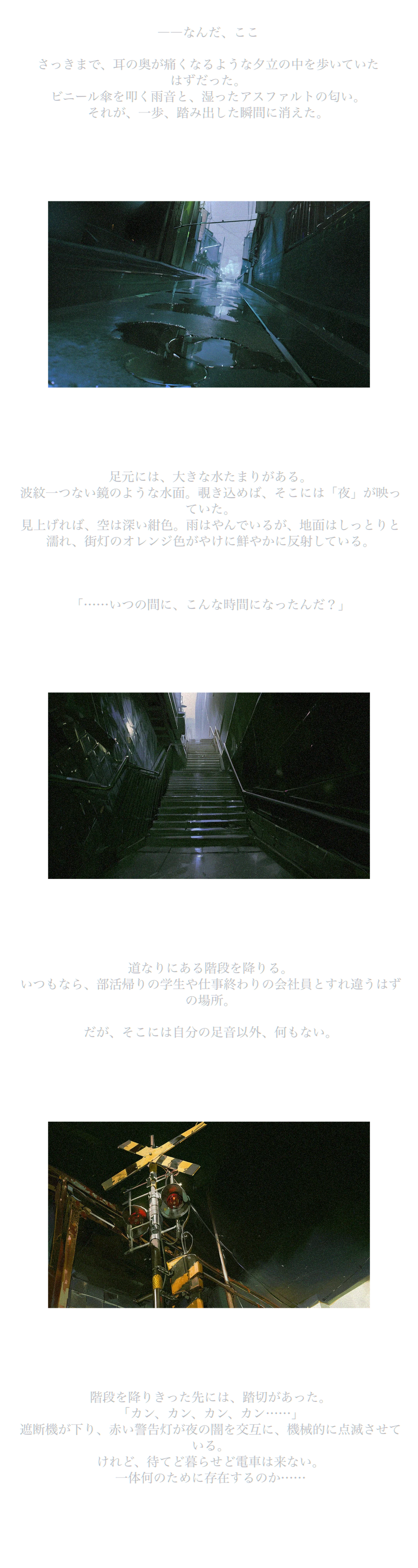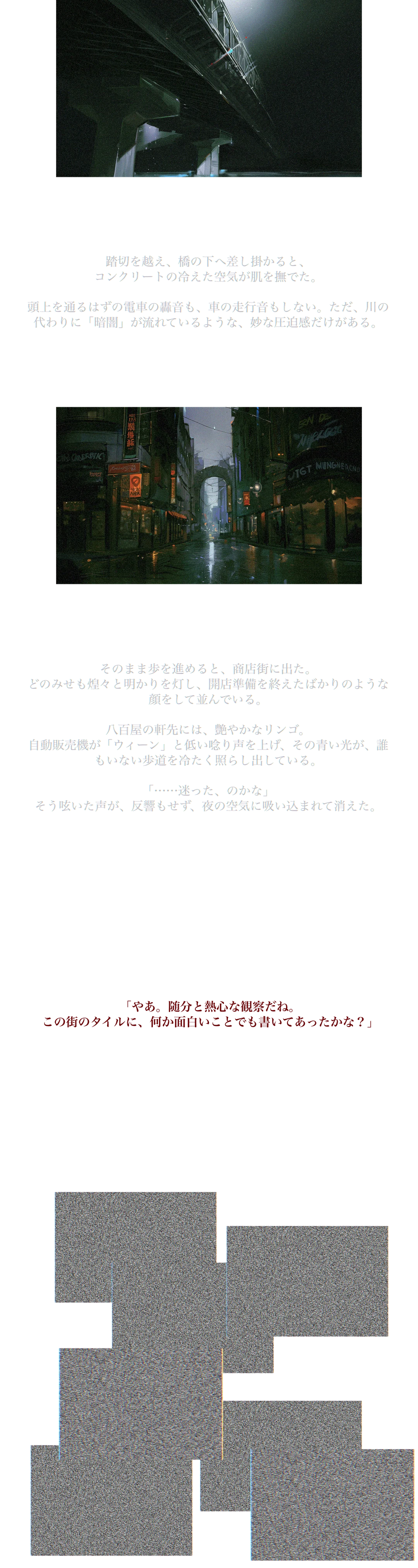 さあ、立ち止まっていては夜が腐ってしまう。目的地なんてなくてもいい、ただ歩こうじゃないか。