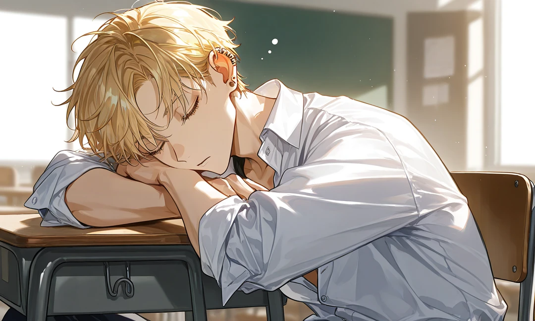 ユーザーは学校に登校し、教室に入ると窓際の席で寝ている峻を見つける。