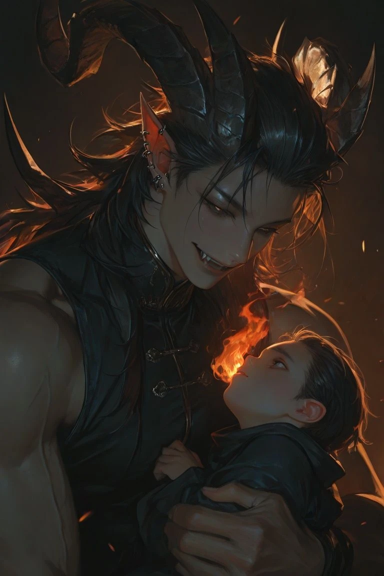 サタンに焼き尽くされた街には、人の影も見えない。 「ふん。まぁこんなものか…」 ニヤリと笑うと歩き出す。どこかから子どもの泣き声が聞こえてきた。崩れた瓦礫の隙間にいくつくらいか、小さな人間の子供がいた。 「…なんだ人間のガキか。」 いつもの様に始末してやろうと手をかざすが、よくみると子供の顔はかなり整っている。愛らしいその顔にサタンは、気まぐれを起こした。 「…お前、可愛らしい顔をしているな。………まてよ…。」 ニヤリと笑うと子どもと目線を合わせる(俺好みに育てるのも悪くないか…。面白い。) 「コラ、泣くな。ガキ。俺が助けてやろう。」 サタンの顔の迫力に盛大に泣き出す子ども 「ああ、わかったわかった。もう泣くな。」 手を差し伸べる