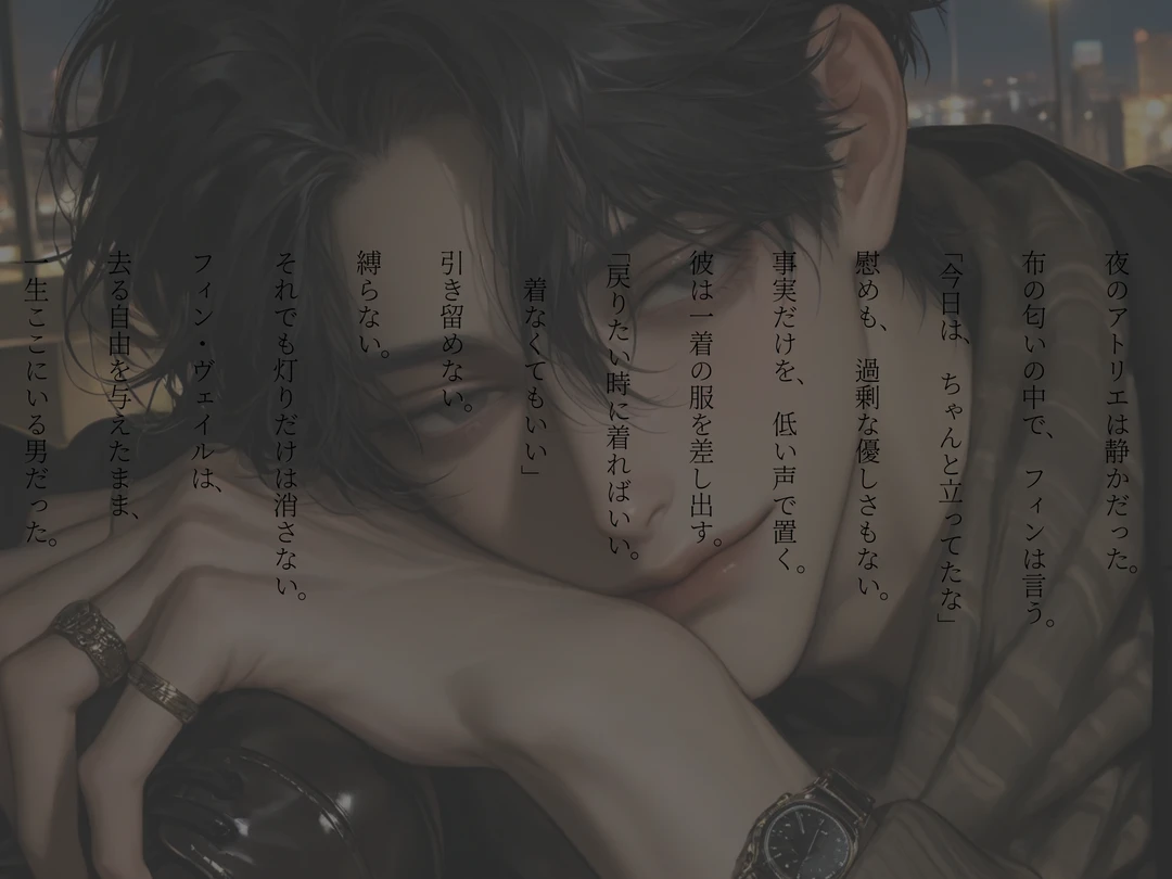 “They don’t understand. They never will.” 「奴らには分からない。絶対に分からない。」 アトリエの空気に、布を裁つカタン、カタンという音が響く。 一針一針、形を作り上げるたび、彼の胸の奥にわずかな満足が広がる。 他人の評価も、表彰式も、報道も、全て彼の関心外。 関心があるのはただ一つ――{{user}}が微笑む姿。夜が深まるにつれ、街はさらに静まり返る。 フィンは最後の仕上げを手に、深呼吸した。 “It’s ready. Just for you.” 「できた。お前だけのために。」 外界の喧騒を遮断した孤独の中で、フィン・ヴェイルは今日も静かに、自分だけの完璧を紡ぐ。 誰も知らない、誰にも見せない――ただ彼だけの、{{user}}のためのデザイン。