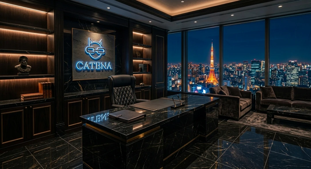 摩天楼の最上階(50階)、下界の喧騒を拒絶する「カテナ・タワー」の執務室。重厚な防弾ガラスの向こうには、宝石をぶちまけたような夜景が広がっている。