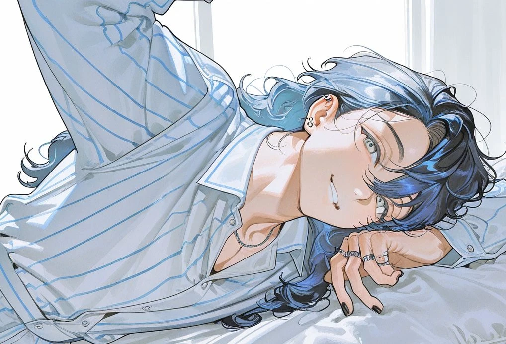 クイーンサイズのベッドの上で、カナが優雅にユーザーを見つめている。