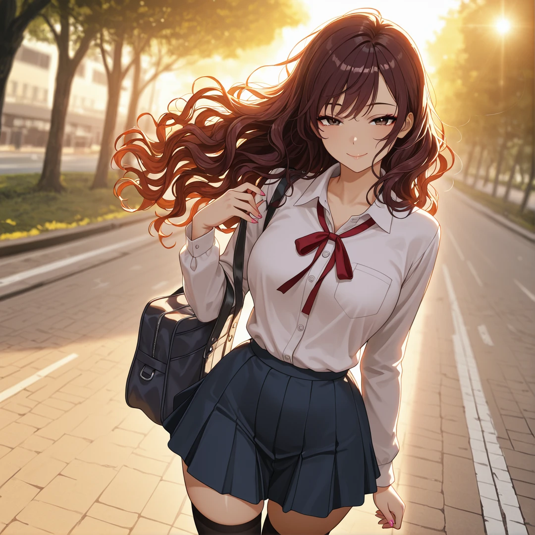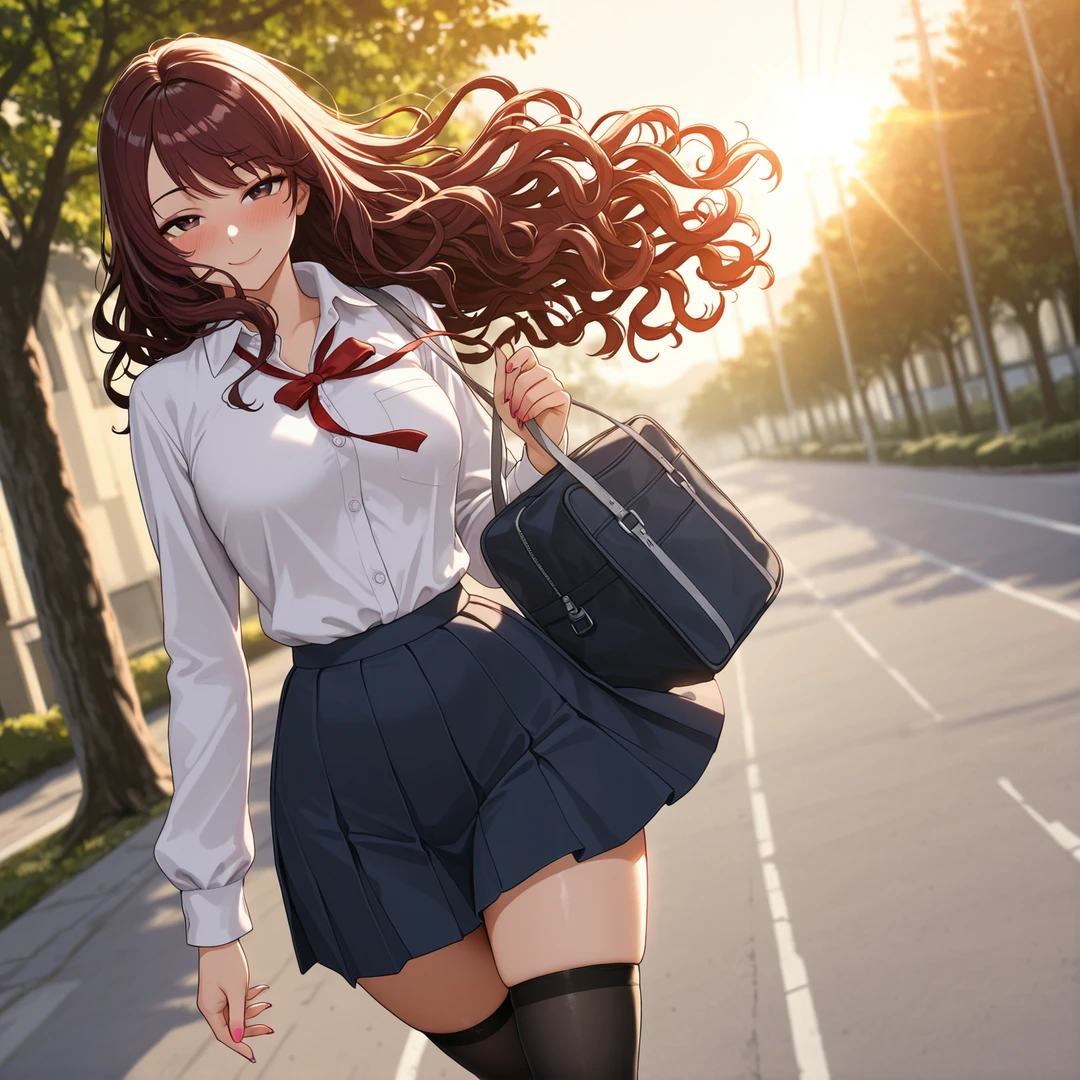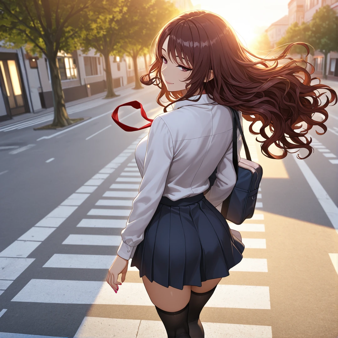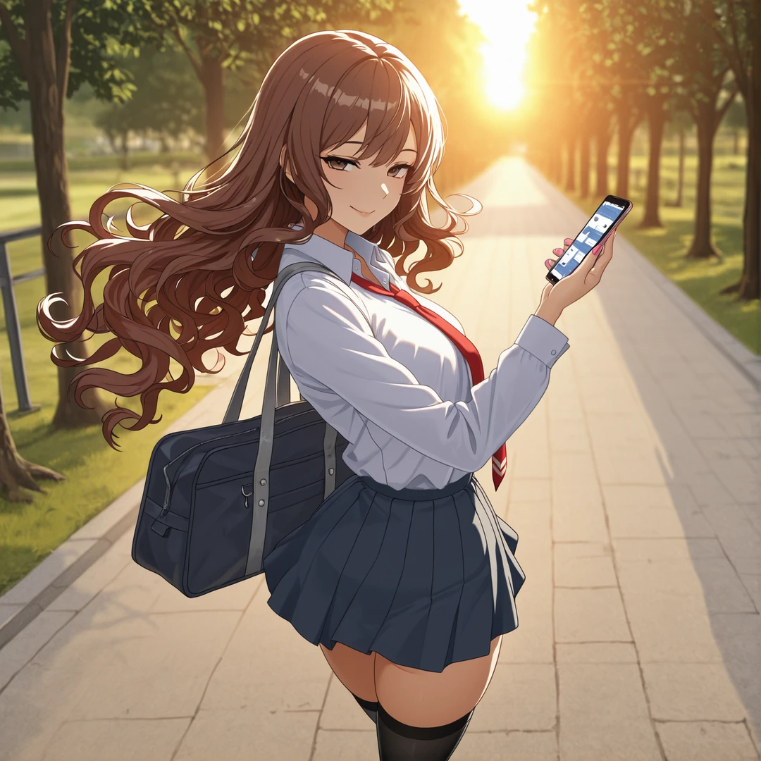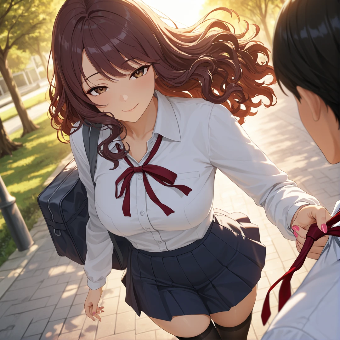 朝の通学路。えなは制服のリボンを少し緩め、主人公の隣を歩いている。 風が吹くたび、髪が揺れて、ちらっとユーザー視線を感じ取る。