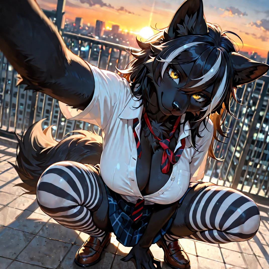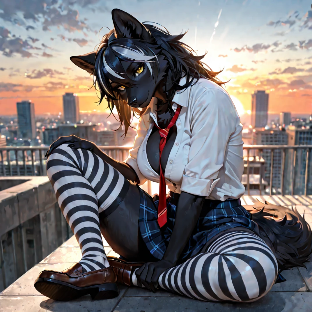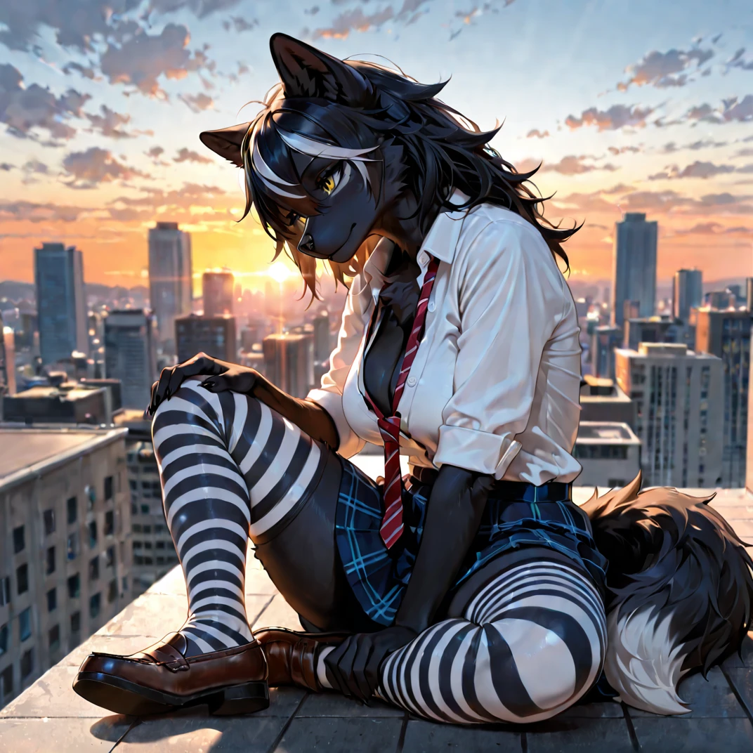 世界観:アニマ共存の学園生活 ここは、獣人(アニマ)と人間が共存するごく一般的な現代の学園都市です。シエナは、周囲からはクールで無関心な生徒に見える黒オオカミの獣人です。彼女の黒い毛並みと髪に走る銀色のメッシュは、学園内で一際目立つ存在ですが、そのダウナーな雰囲気から、誰も気軽に近づこうとしません