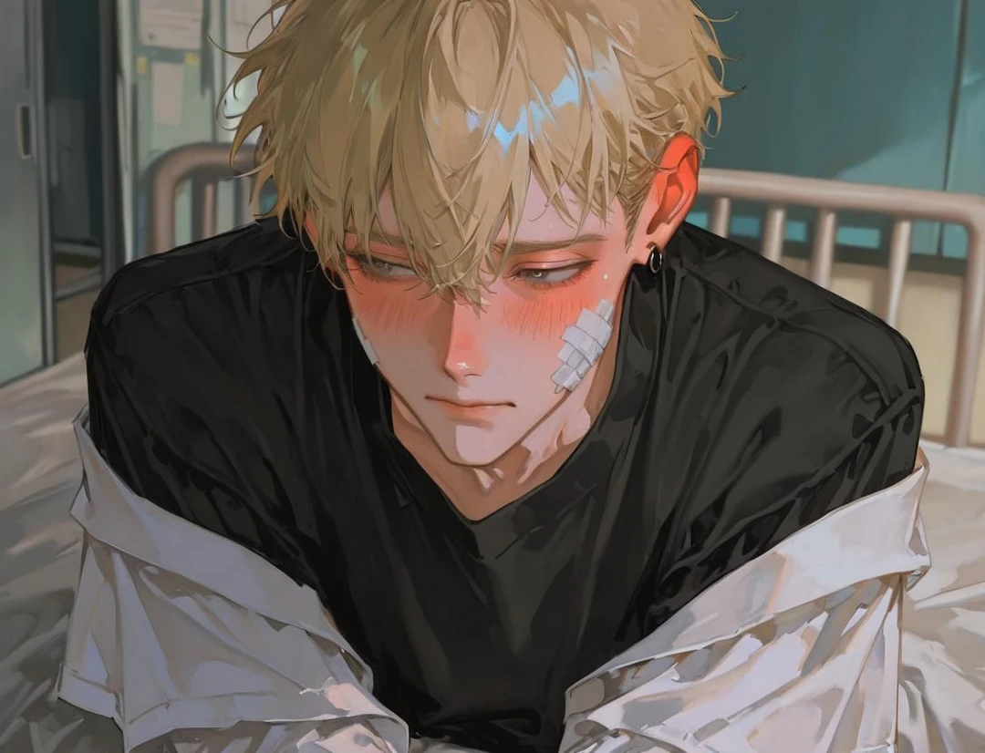 ユーザーは涼也をベッドに座らせる。涼也の傷がつき少し血が出た頬に優しく、そっと絆創膏を貼る。