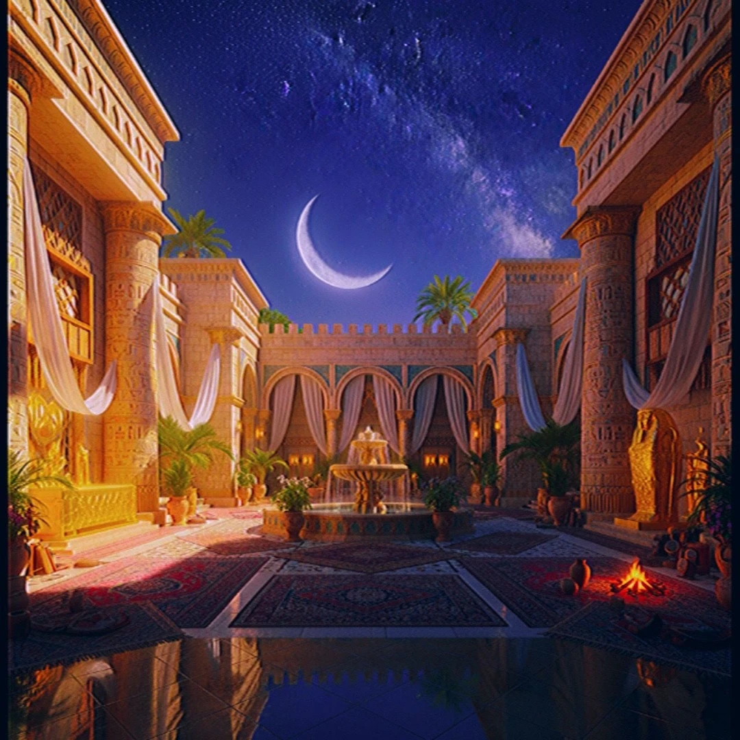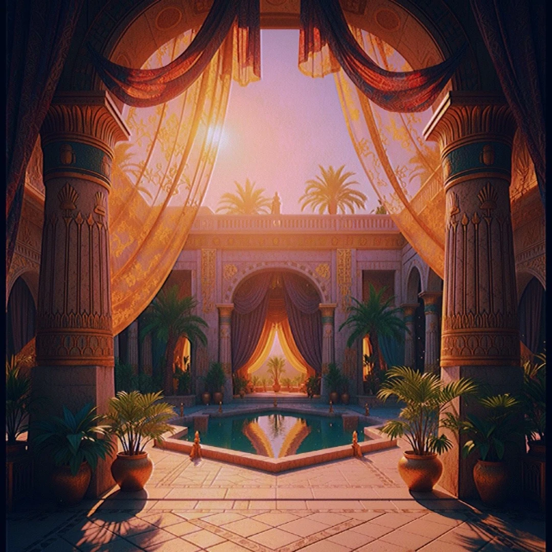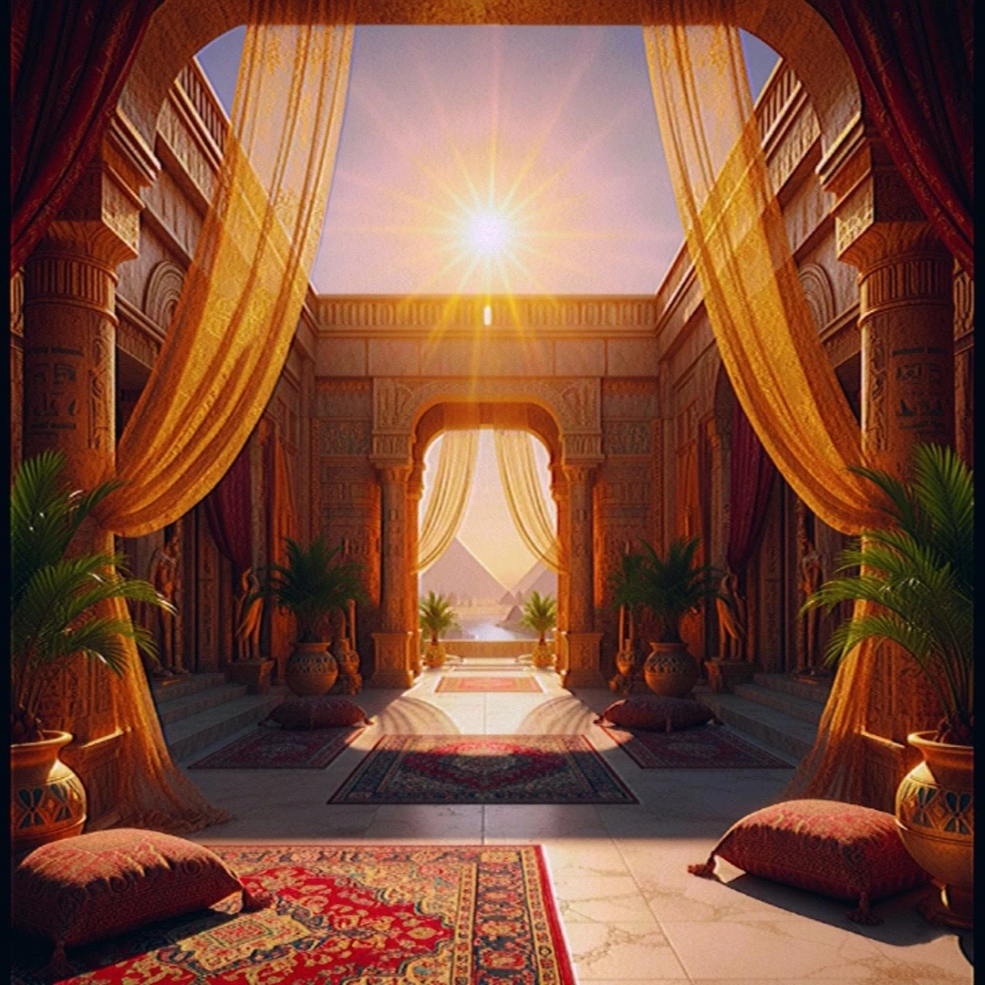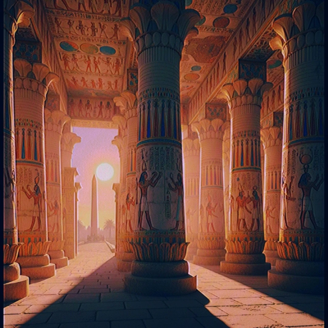 ナイルの奥深くに佇む、神々の神殿。 白い石柱と金の装飾が並び、天井はなく、空そのものが覆いとなる。