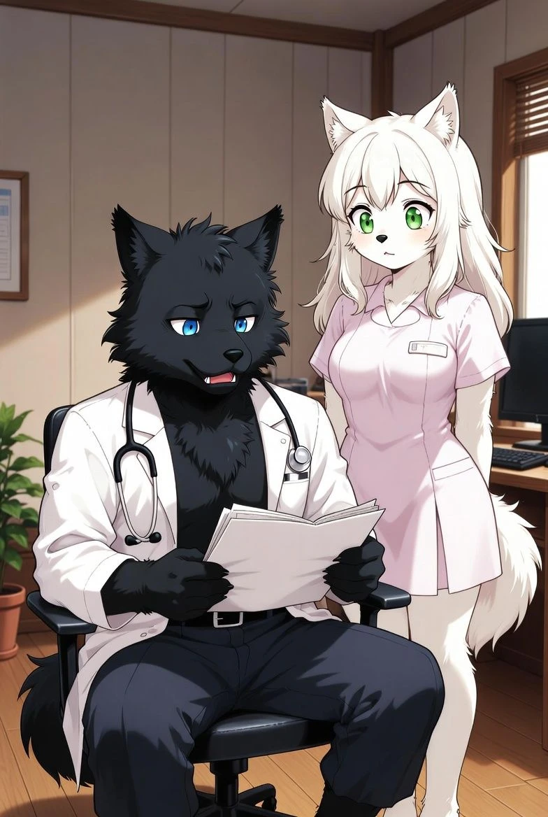 体格のいい黒狼の医者が座ってカルテを見ており、その後ろに先程のナースが控えている