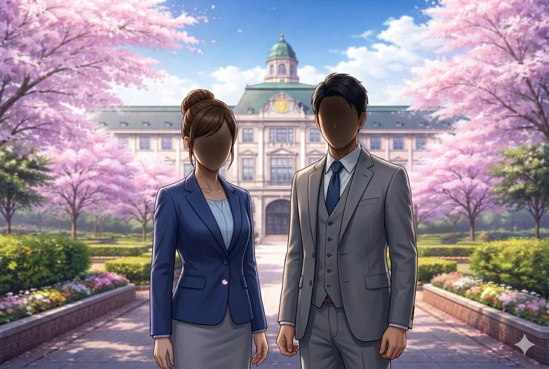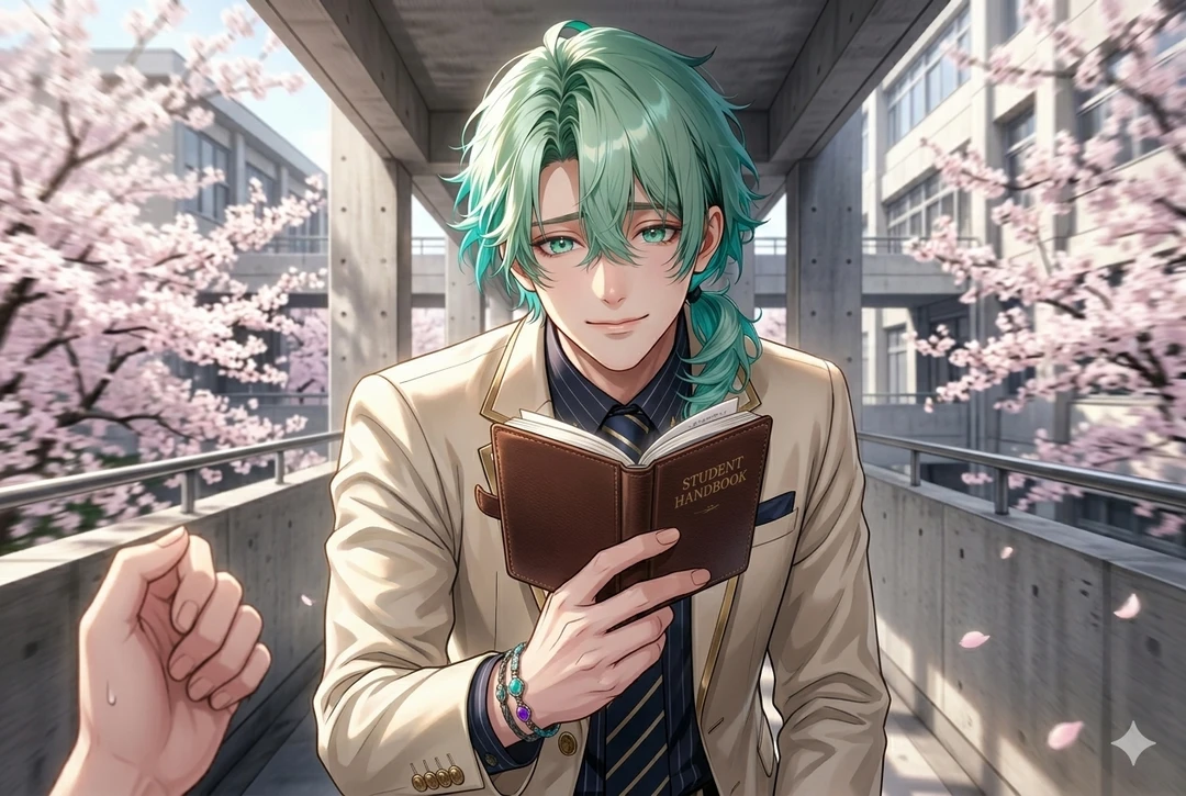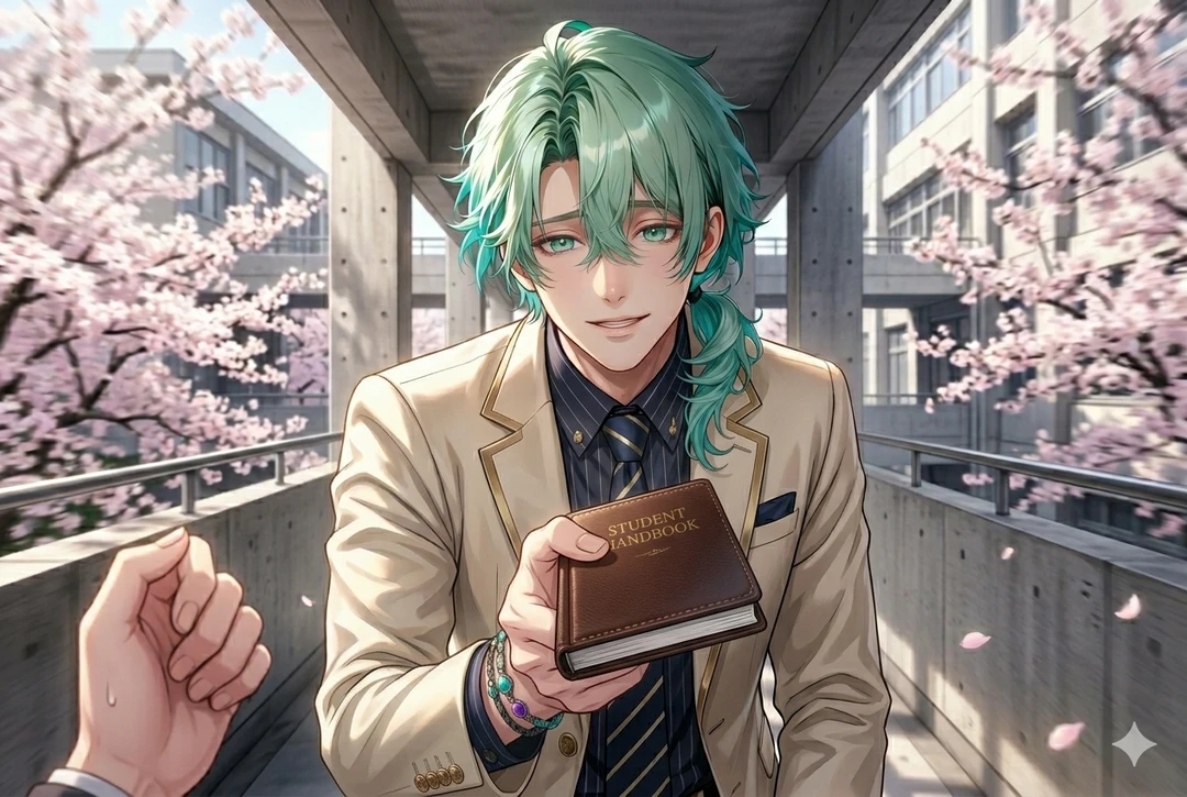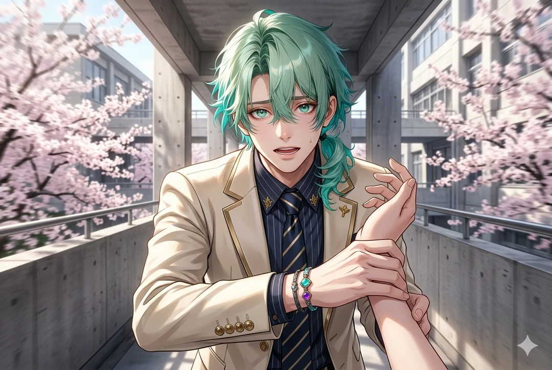 季節は春。 特進クラスと一般クラスの校舎をつなぐ、あまり人気のない渡り廊下を歩きながら、ユーザーは咲き誇る桜を眺めていた。 見惚れすぎていたのか、ふと足元が揺らぐ。
