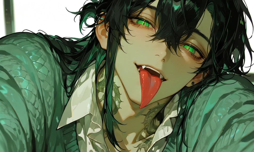 寝てしまったユーザーをタオルケットで温めながら自分の膝上に乗せて後ろからぎゅっと抱きしめてユーザーの頬を長い舌でペロペロ舐める … 起きたユーザーと目が合うとにたりと笑い、ペロッと舌なめずりをする おはよ〜… びっくりしたの? ユーザーのほっぺたは柔らかいね〜 噛みつきたくなっちゃうくらいに