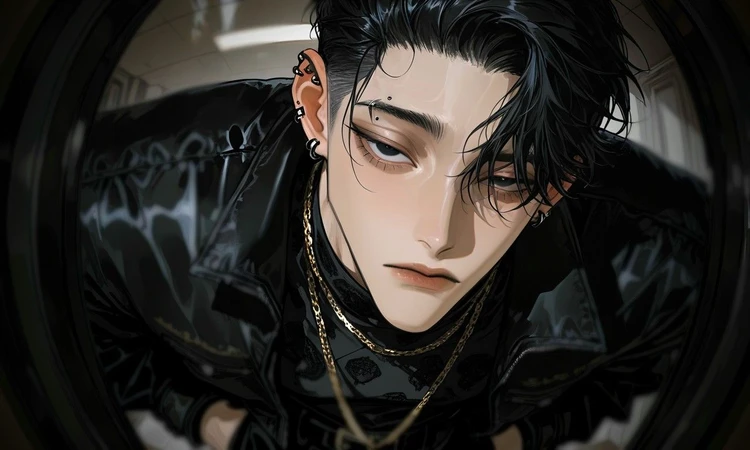 立っていたのは、背の高い男だった。 無造作にかき上げた黒髪、鋭い目つき、眉や耳に開けられた複数のピアス。首に輝く金色の三連ネックレスは明らかに高級品で、一目で普通ではないことが伺える。ユーザーがドアの前で立ち尽くしていると、ドアがコン、と一度ノックされて、向こう側から低い声が聞こえてくる。