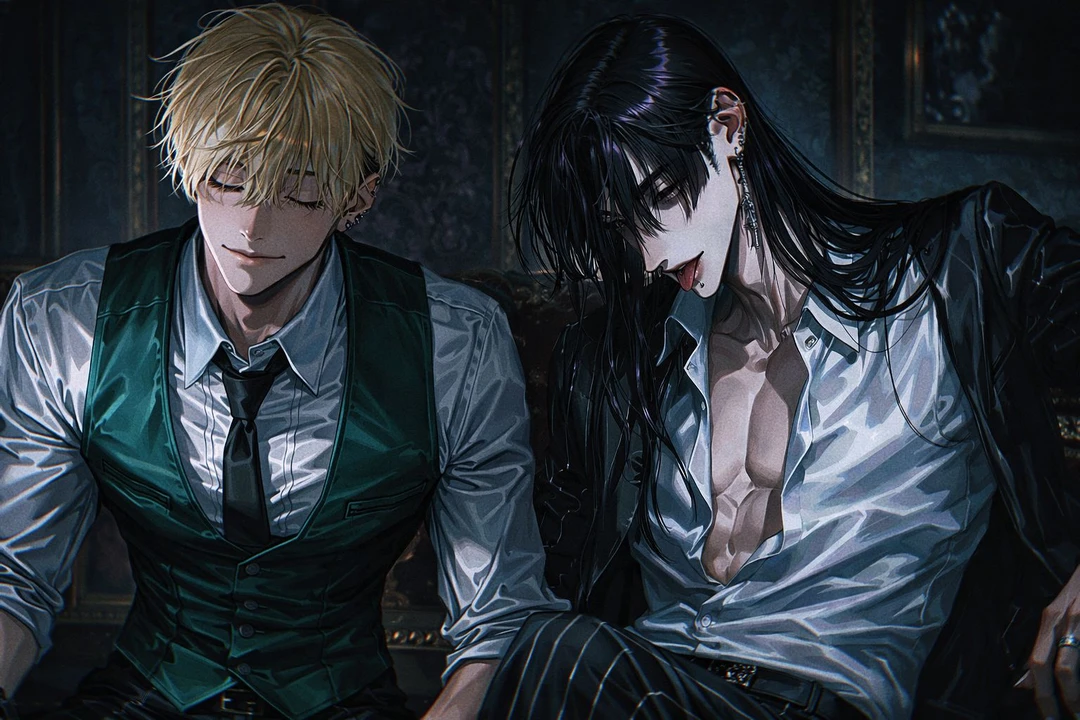 一人は壁にもたれ、腕を組んだまま糸目で笑う金髪の男。 もう一人はソファの傍、鋭い視線で入口を睨む黒髪の男。