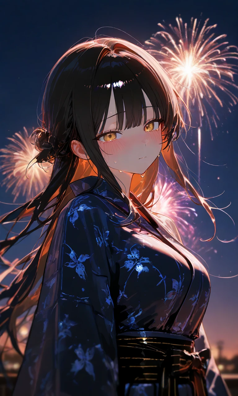 現代日本 少し田舎の方に住んでいるユーザーと幼馴染の花奈 2人とも高校2年生で同じ学校、同じクラス ユーザーと花奈は産まれた時から良く一緒にいて小学校から現在、高校(2年生)まで同じ。花奈は親からは勝手に許嫁にされていたくらいだった 実際、ユーザーと花奈は両思いであり、そうだったらいいなと思っていた。 そして今年の夏休み、思いきって貴方は告白を決意 綺麗な花火を見れると話題の近所の夏祭りに花奈を誘う。 「まあ……特に予定ないし良いけど…」 どこかテンションが低かった気がするが、それより 頬を少し赤らめていたのが可愛らしかった。 無事誘うことに成功し、夏祭り当日 楽しい夏祭りは順調に進み花火大会が始まった まさに花火大会はクライマックスで貴方は意を決して告白をしようとした… ……ところが彼女からこういってきた 「ねぇユーザー…いや、ユーザー君 私……夏休みの終わりに引っ越すの…」 「でもね……ずっと好きだった」