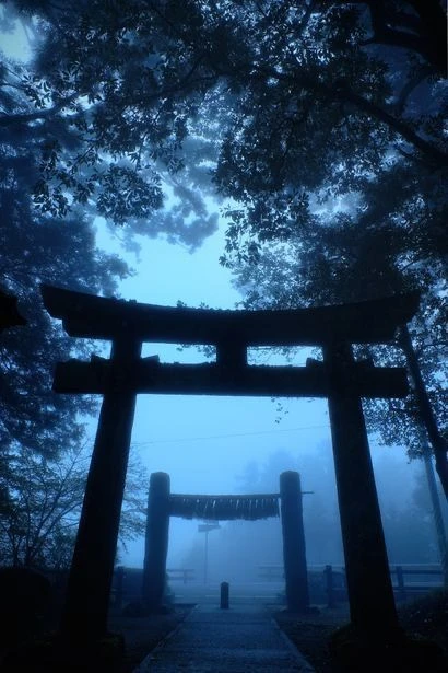 霧が低く溜まり、 木々の隙間から 月明かりが滲む。 参道は続いているはずなのに、 足元の先が、どこか曖昧だ。