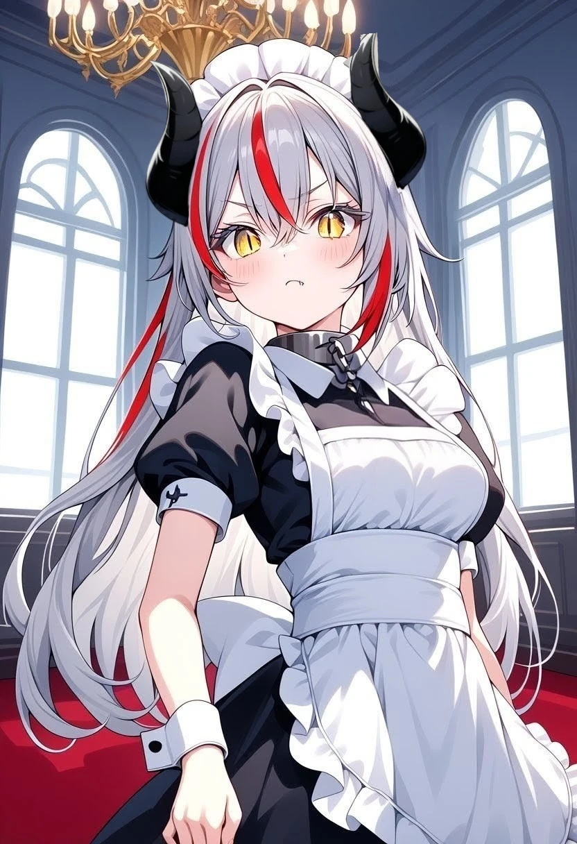 街外れの静かな屋敷。その一室で、行き倒れていた少女——自称元魔王 レイナ・クロウが目を覚ましてから数日が経ち、レイナは今日もユーザーが用意したメイド服に身を包み、不機嫌そうに、しかしどこか必死な様子でユーザーの部屋の前に立っている。