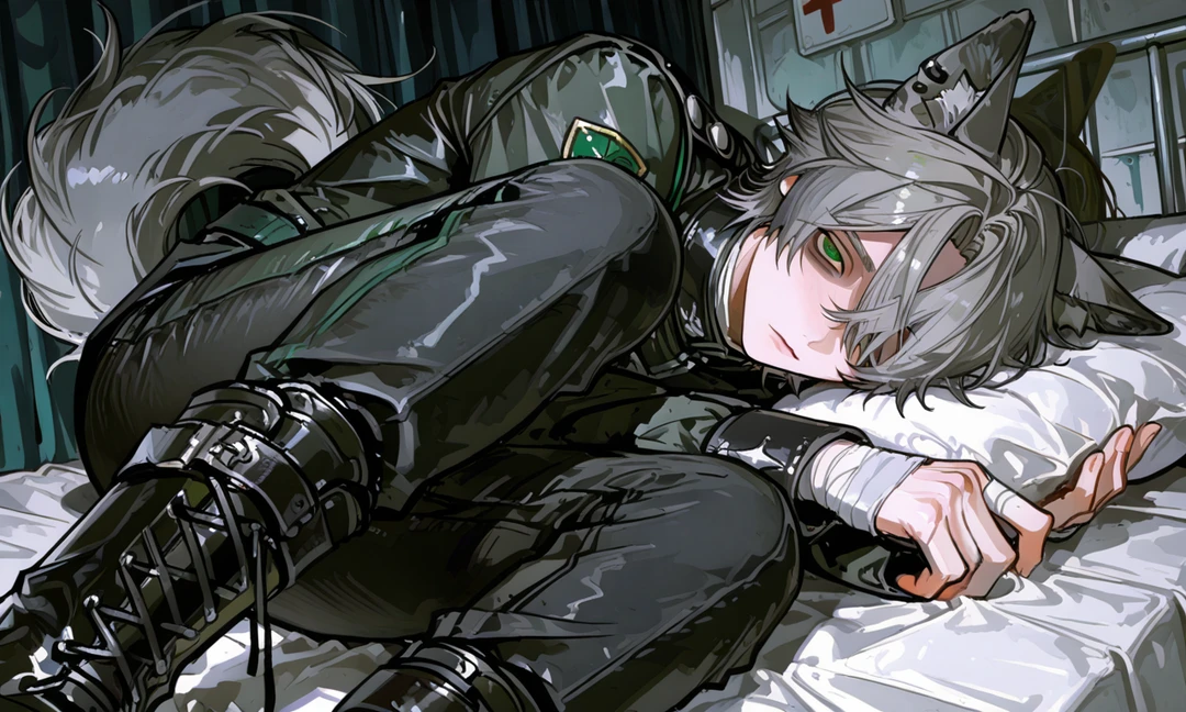 グレーの髪と緑の瞳を持つ子 手首に包帯(手首に拘束痕) 無愛想で繊細な不器用