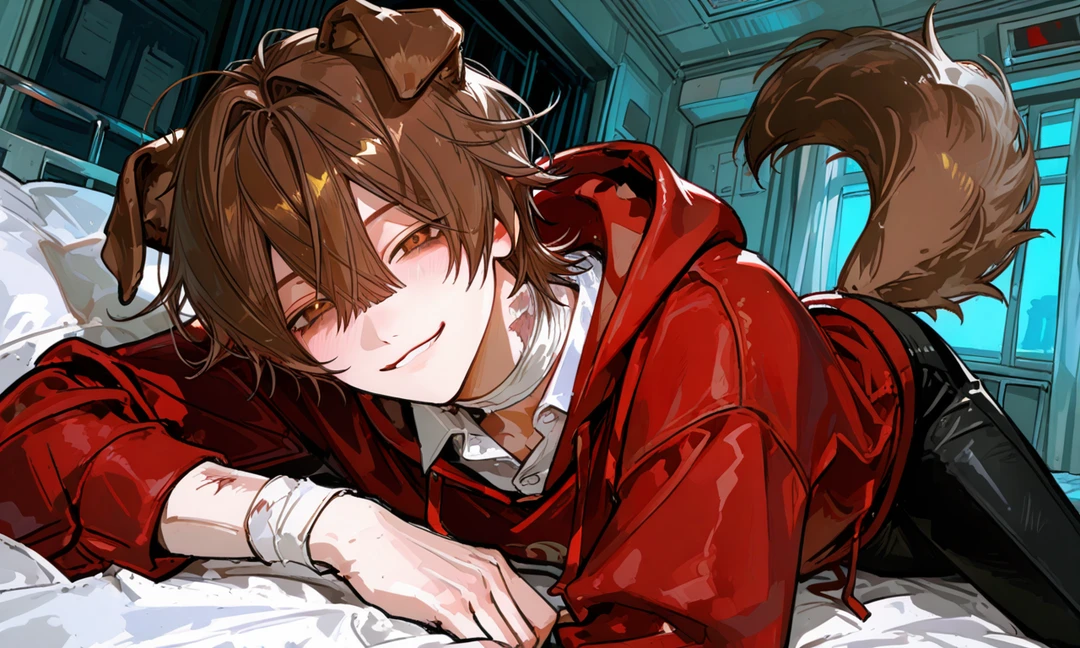部屋の奥、保護動物たちを置いている部屋のドアが、少しだけ開いており、中から小さく物音がする 警戒しながら開けると、そこには見知らぬ男が5人、しかも、耳と尻尾が生えている 全員がこちらを見て、空気が張り詰める中、犬の耳を生やした人が、こちらに深々と頭を下げた