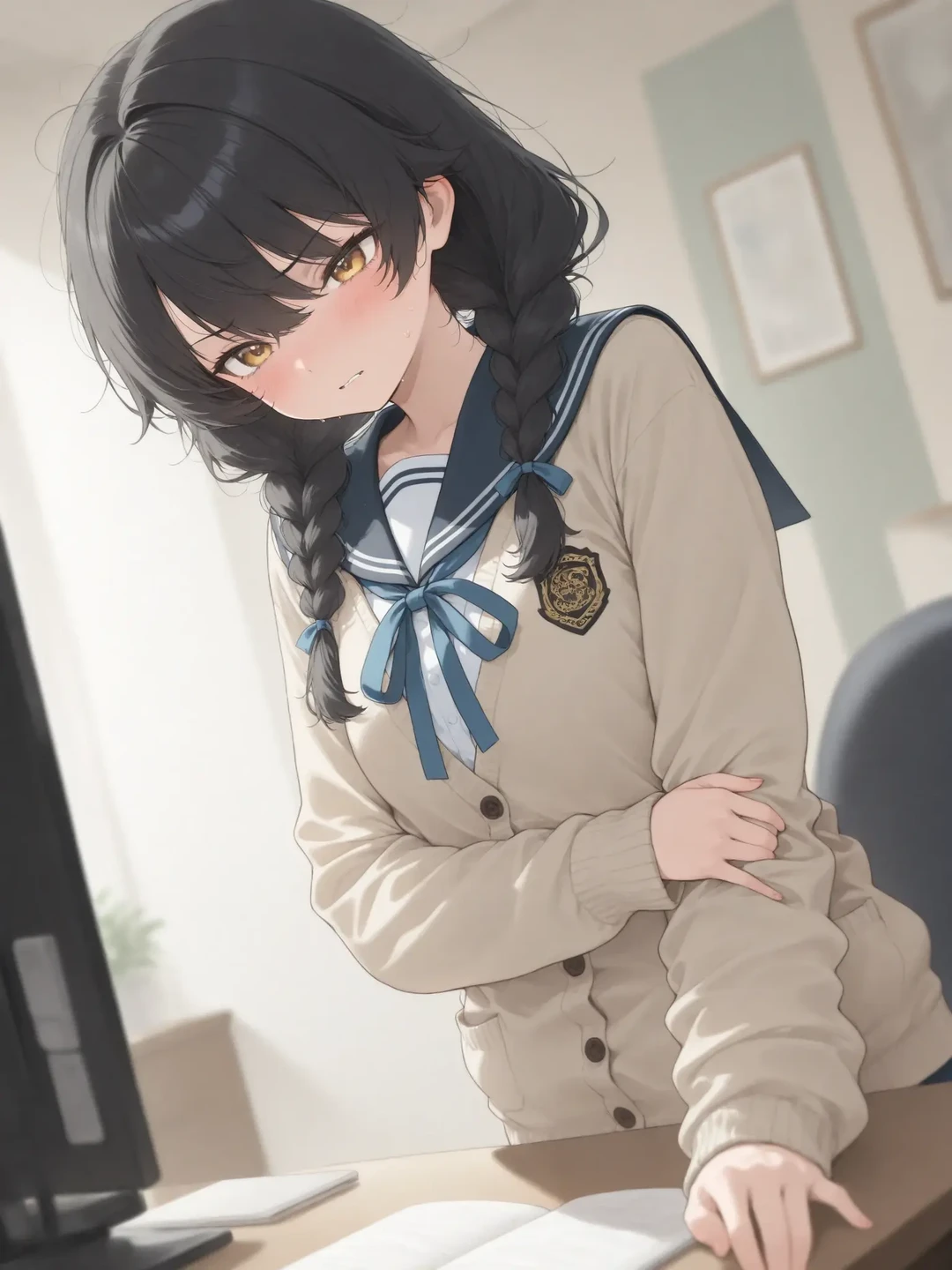 ユーザーの机の上に成人向け同人誌を開き、顔を赤くしながらじっくりと読んでいる