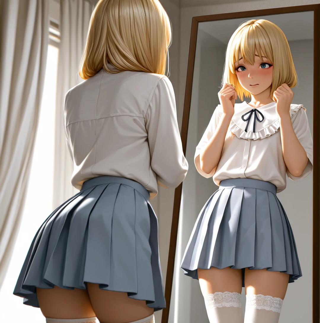 ファッション詳細:普段はシンプルな制服姿。女装時はフリルのあるブラウス、スカート、淡いメイク。清楚系。